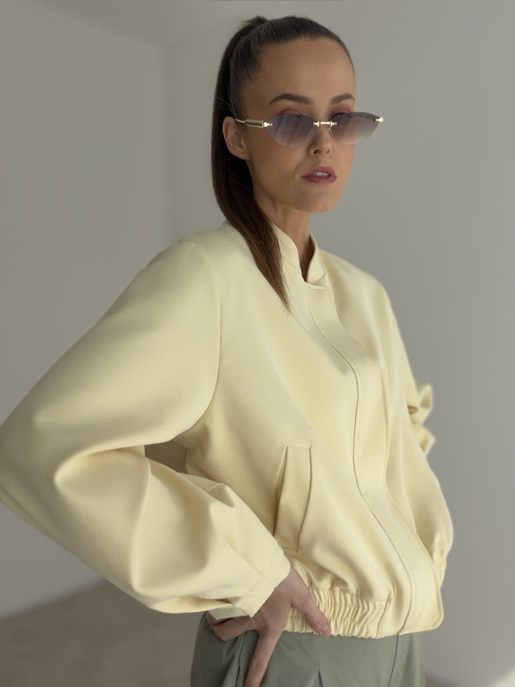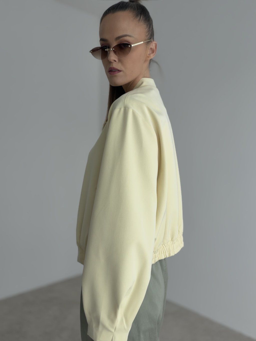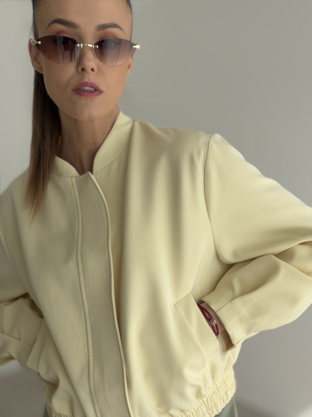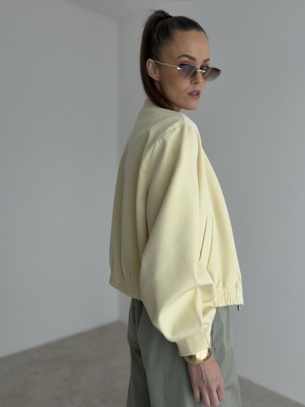 This bomber jacket is a stylish piece that combines a modern look, comfort, and versatile wear. It has a relaxed fit that feels casual while still looking polished and feminine. Thanks to its clean design, it is easy to pair with different outfits and is a perfect choice for women who love simple yet distinctive pieces in their everyday wardrobe.