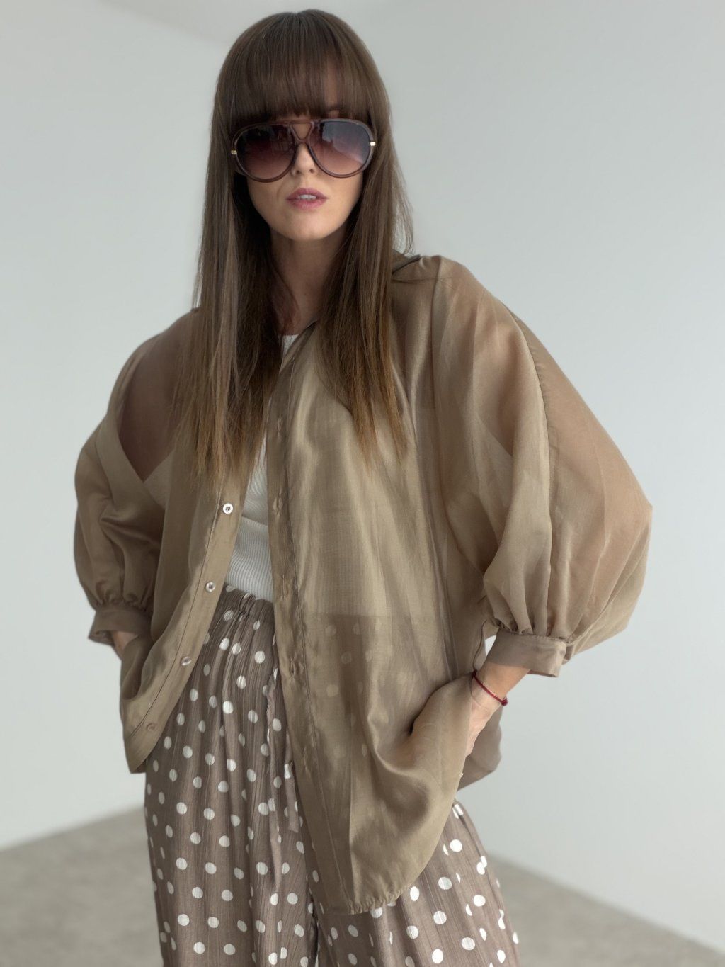 This chiffon shirt feels light, elegant, and beautifully feminine. The airy fabric creates a soft, flowing effect that adds a sophisticated and stylish touch to any outfit. Its relaxed fit and gently voluminous sleeves make it a statement piece while still being easy to wear for many different occasions.