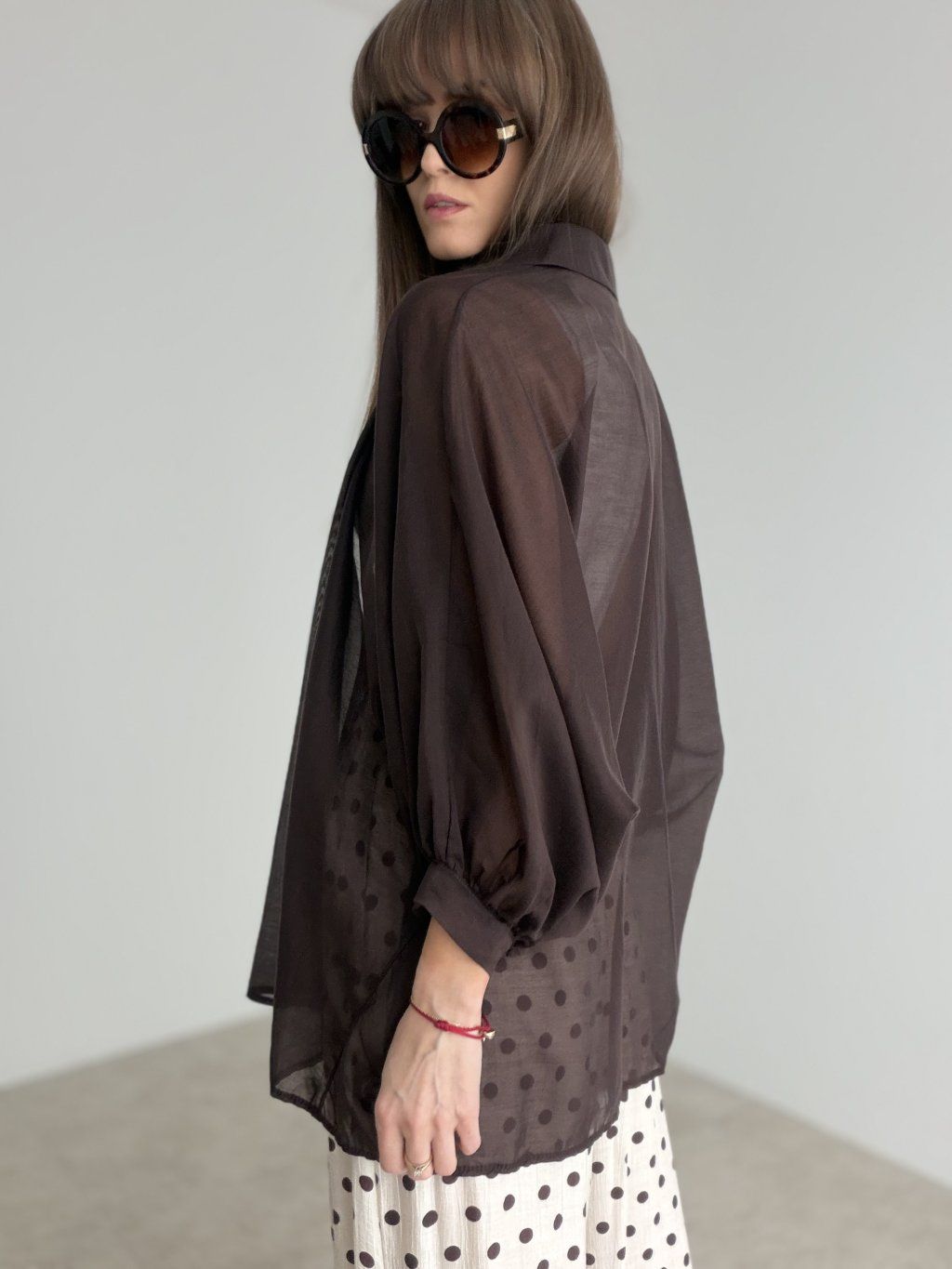 This chiffon shirt feels light, elegant, and beautifully feminine. The airy fabric creates a soft, flowing effect that adds a sophisticated and stylish touch to any outfit. Its relaxed fit and gently voluminous sleeves make it a statement piece while still being easy to wear for many different occasions.