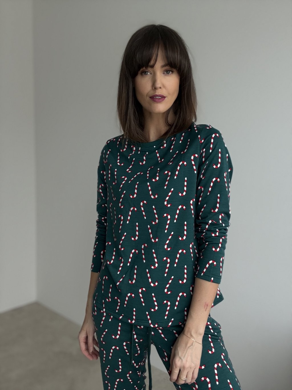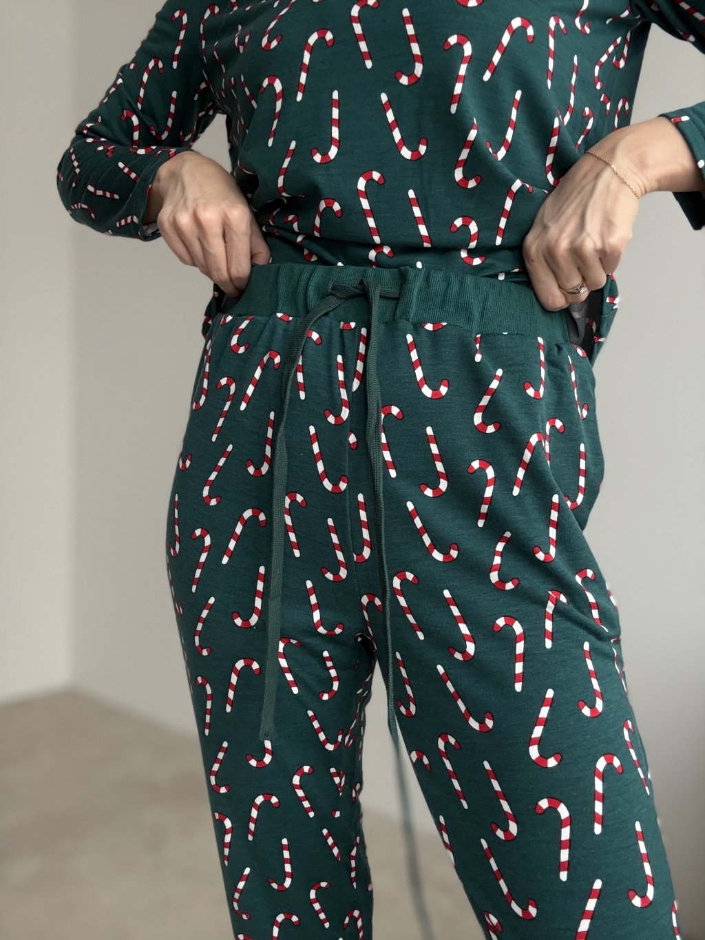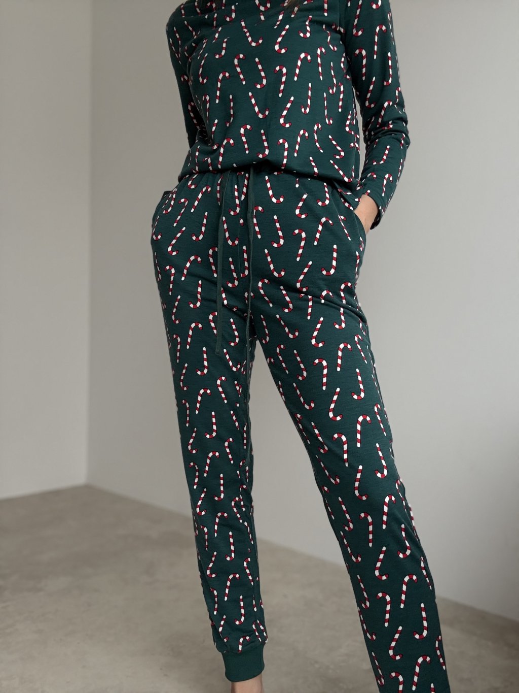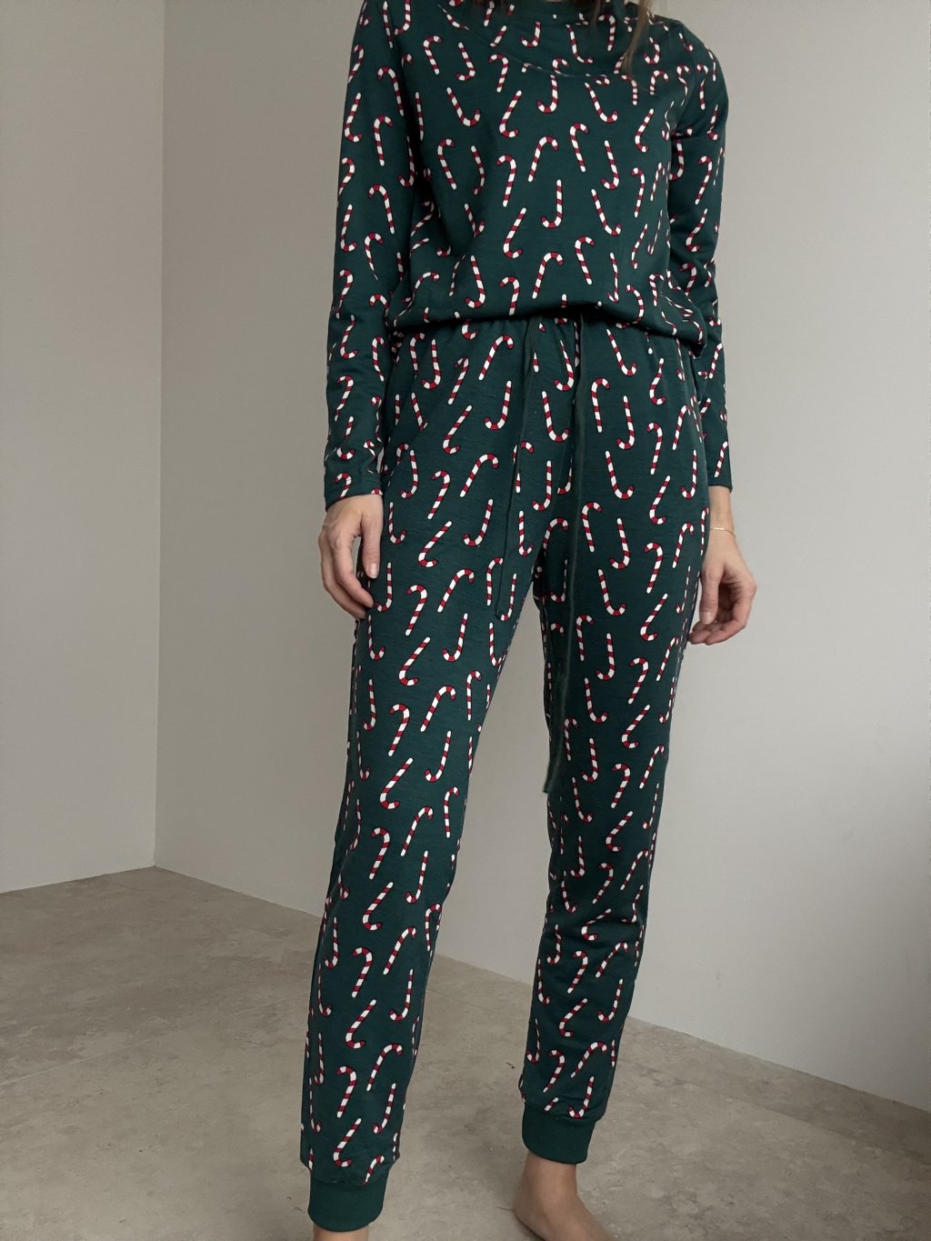 A cosy Christmas pyjama set made from soft, comfortable fabric – perfect for winter evenings, festive days and relaxing at home. The top features a relaxed fit with long sleeves and a comfortable neckline, making it ideal for all-day and night wear. The trousers come with an elastic waistband and drawstring, finished with cuffs to keep them in place. The entire set is decorated with a playful candy cane pattern, adding a festive and cheerful touch.