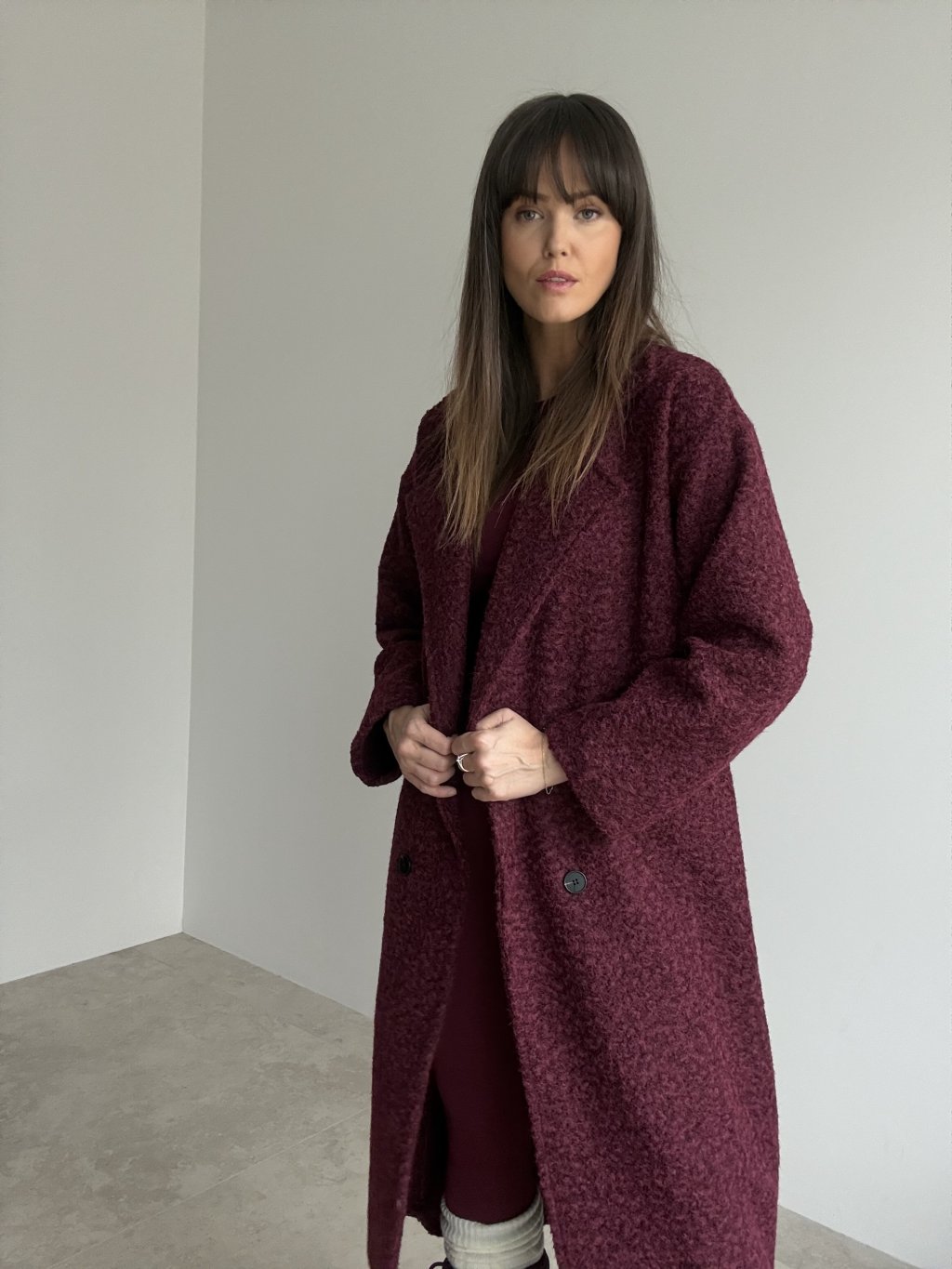 Long, relaxed-fit coat that combines elegance with everyday winter comfort. The soft, textured fabric feels cozy, keeps its shape nicely and provides pleasant warmth on colder days. It features a classic notched lapel, front button fastening and practical side pockets. The coat is unlined, which makes it lighter, easy to layer over knitwear, dresses or a blazer, and perfect for creating effortless layered looks. Thanks to its slightly oversized silhouette, it layers beautifully and creates a modern, clean winter style for both casual and more dressed-up occasions.