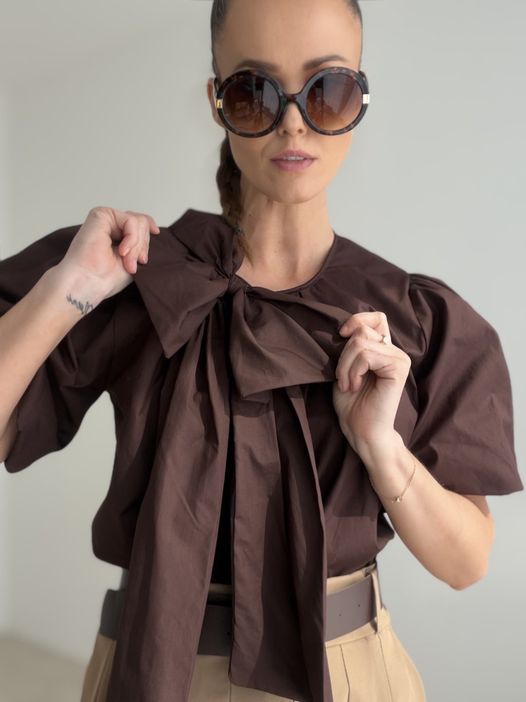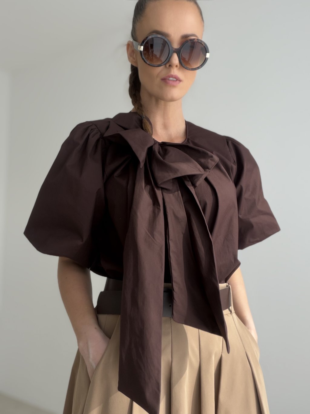 An elegant cotton blouse with statement sleeves and a refined neck tie detail that creates a feminine and sophisticated look. A perfect piece for elegant and smart casual outfits.