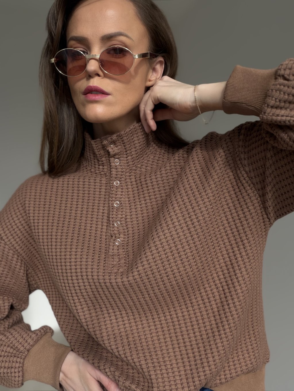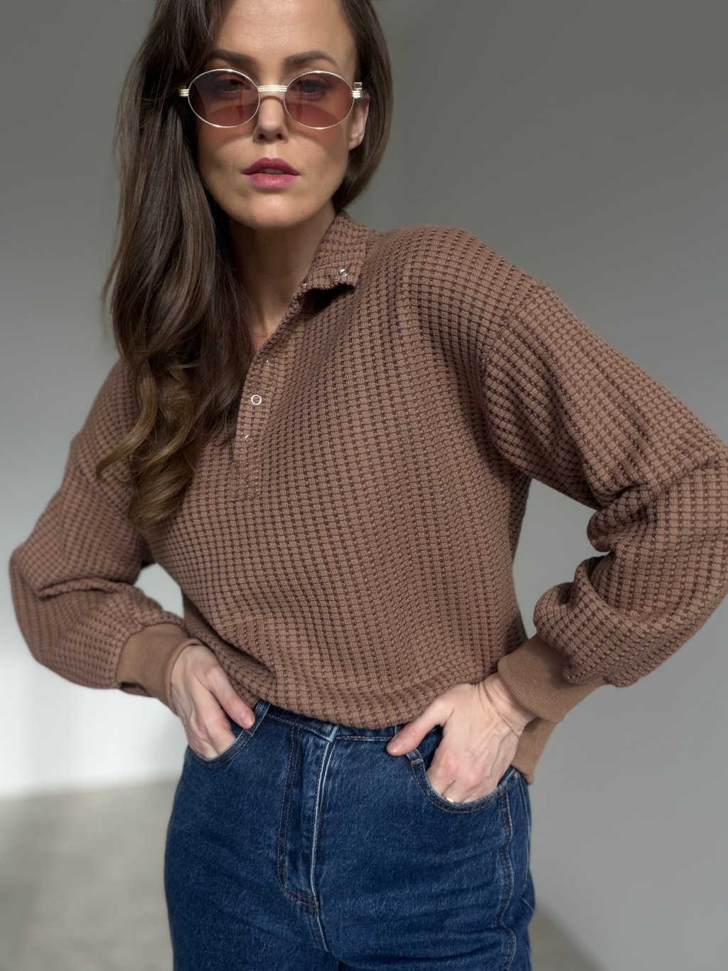 A cotton sweatshirt with a pronounced textured finish that feels comfortable while looking polished. Designed with a collar and a short button placket, it elevates a casual outfit and makes styling effortless for everyday city looks. The relaxed, slightly shorter cut pairs beautifully with high-waisted bottoms. Dropped shoulders and softly ballooned sleeves create a modern silhouette, while the cuffs keep the sleeves neatly in place. The structured surface adds visual interest, making it a reliable wardrobe staple when you want simplicity with a refined touch.