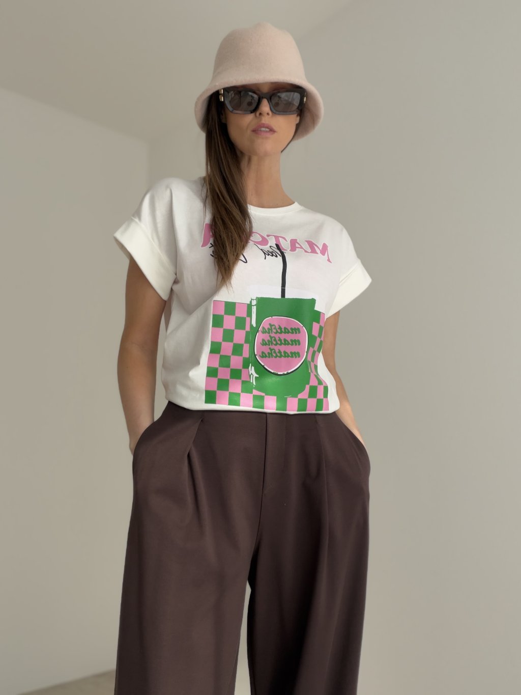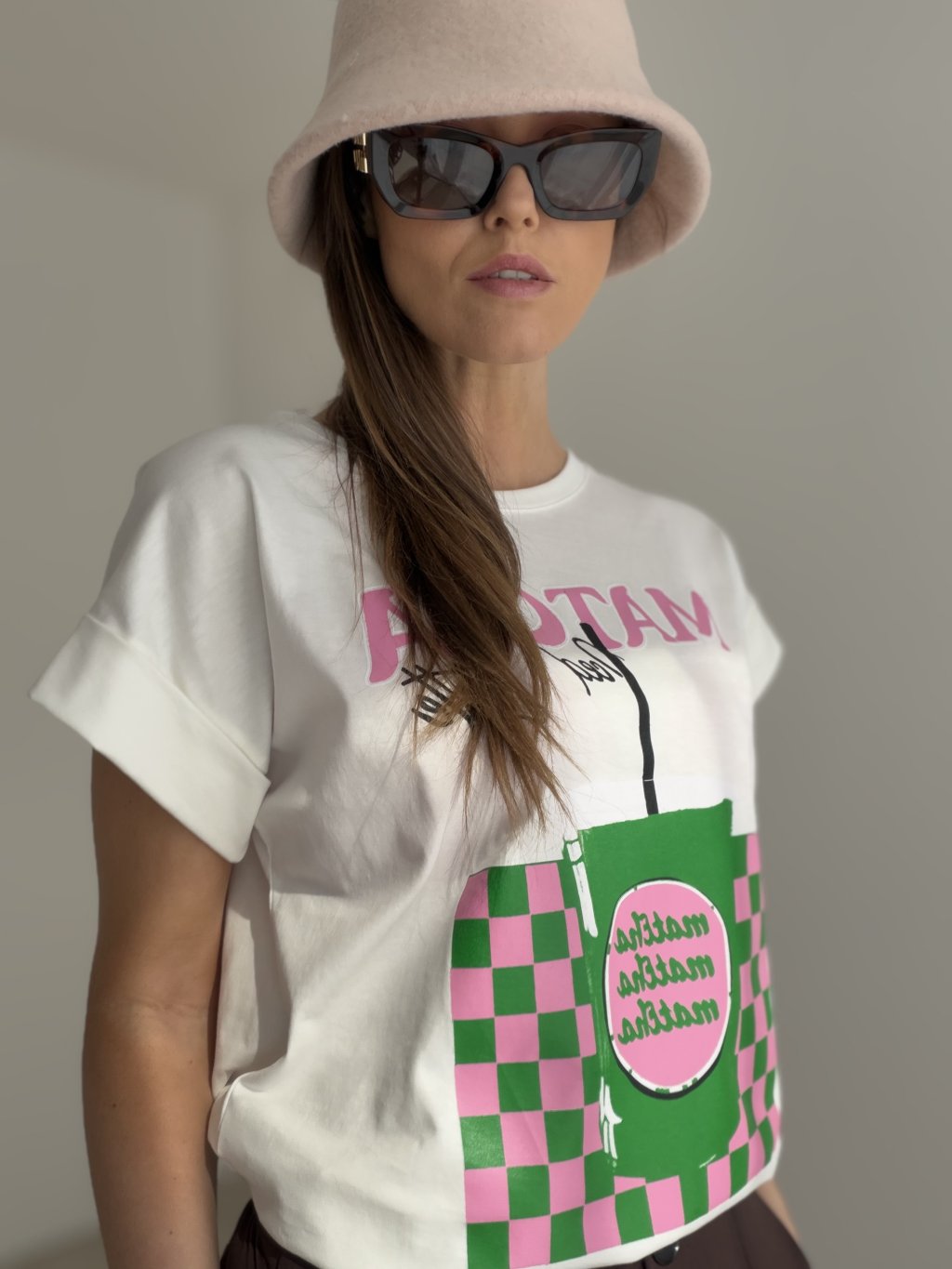 This cotton T-shirt is a stylish and comfortable piece that deserves a place in every wardrobe. It features a relaxed fit, soft material and a modern look, making it perfect for everyday wear. The front print adds a fresh and trendy touch, giving the design a playful yet fashionable character. The dropped sleeves and easy silhouette create a casual feel while still looking feminine and current.