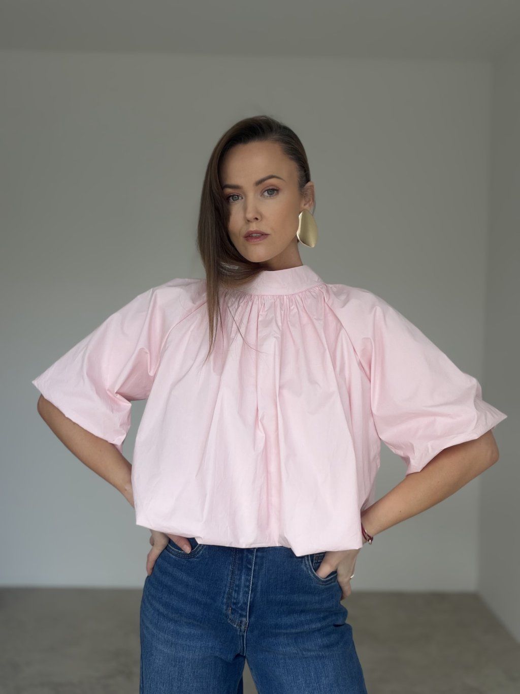 This cotton top feels soft, airy, and effortlessly elegant. Its looser silhouette gives the outfit a light and relaxed feel, while the gathered neckline and more voluminous sleeves create a feminine and refined effect. The overall look is modern yet timeless, making it easy to style for both everyday wear and more elevated occasions.