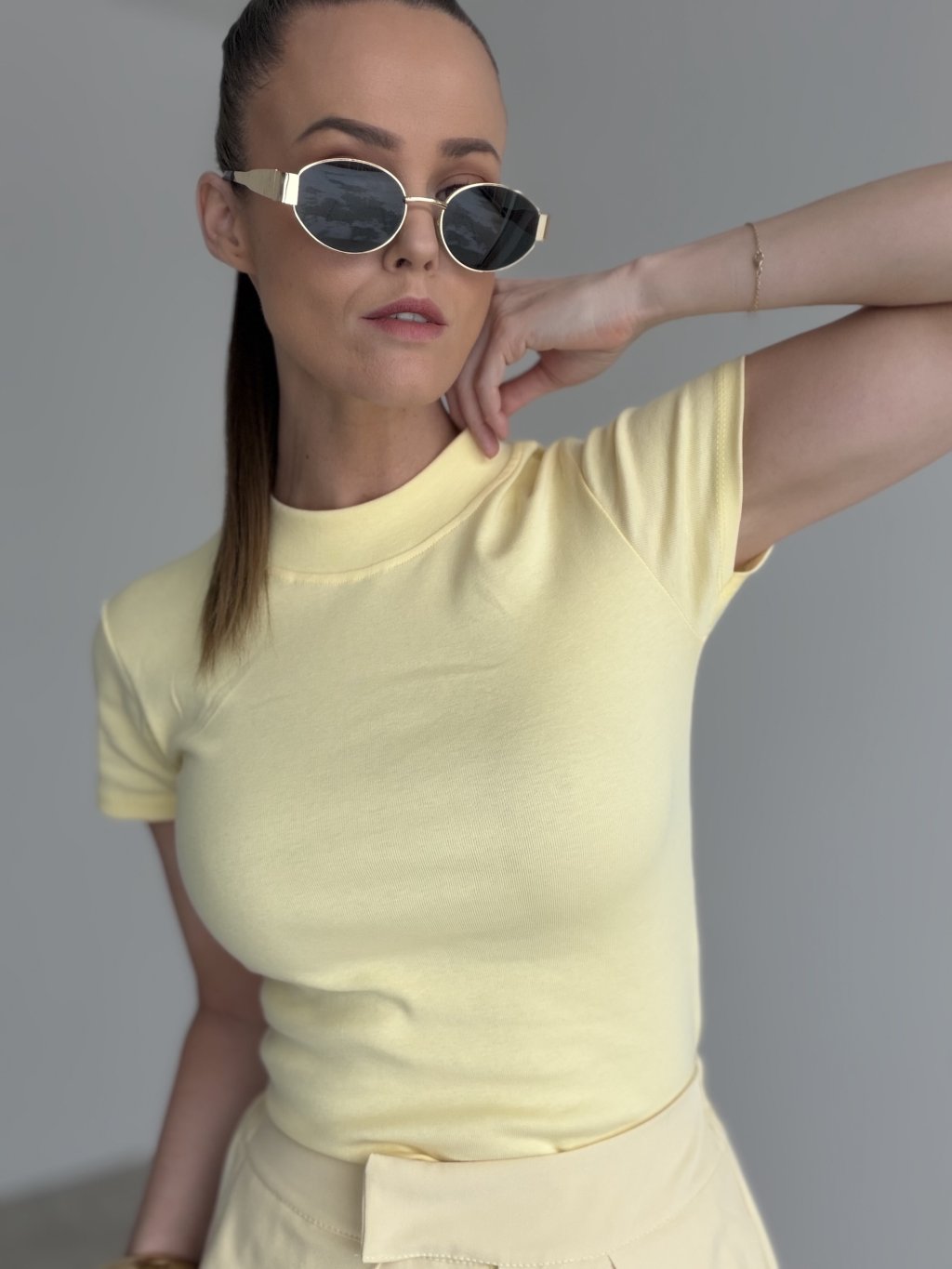 This cotton top is a timeless wardrobe staple defined by a clean silhouette and refined finishing. The fitted shape flatters the figure while staying comfortable for all-day wear. Short sleeves and a higher crew neckline create a polished, minimalist look that pairs effortlessly with both casual and elevated outfits. The fabric feels soft against the skin and works perfectly for layering under blazers, shirts, or jackets, while also looking great on its own.
