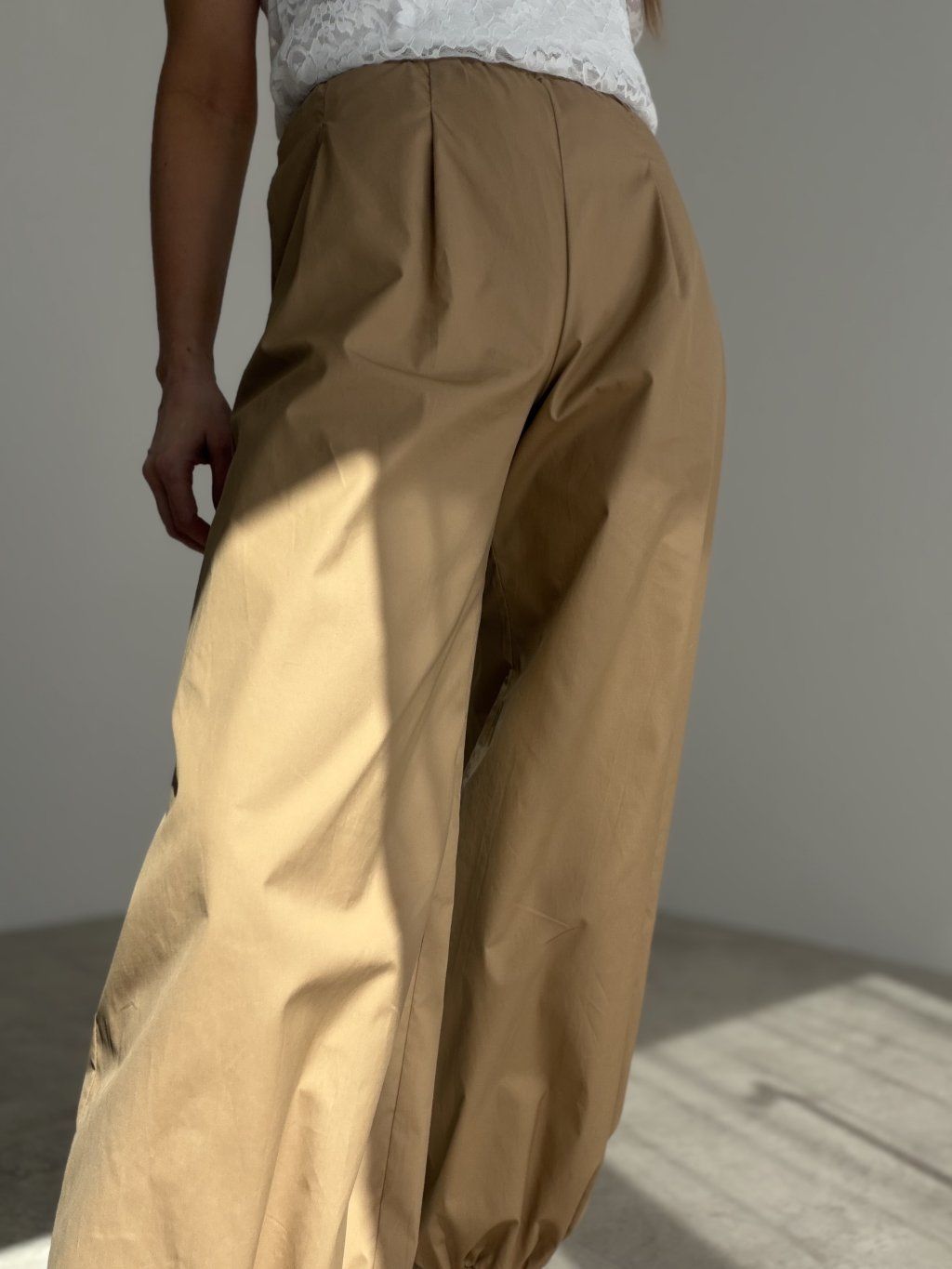These trousers combine comfort, lightness and effortless elegance in one piece. The high waist flatters the silhouette, while the softly voluminous shape creates a modern and distinctive look. Practical pockets and elasticated hems add an original touch, making them a standout piece in any wardrobe.