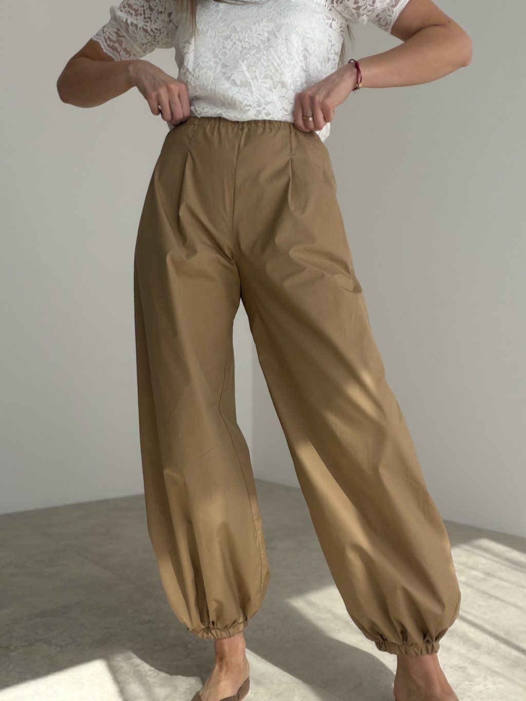 Relaxed high-waisted trousers with pockets and elasticated hems. A comfortable yet stylish piece that is easy to wear every day.