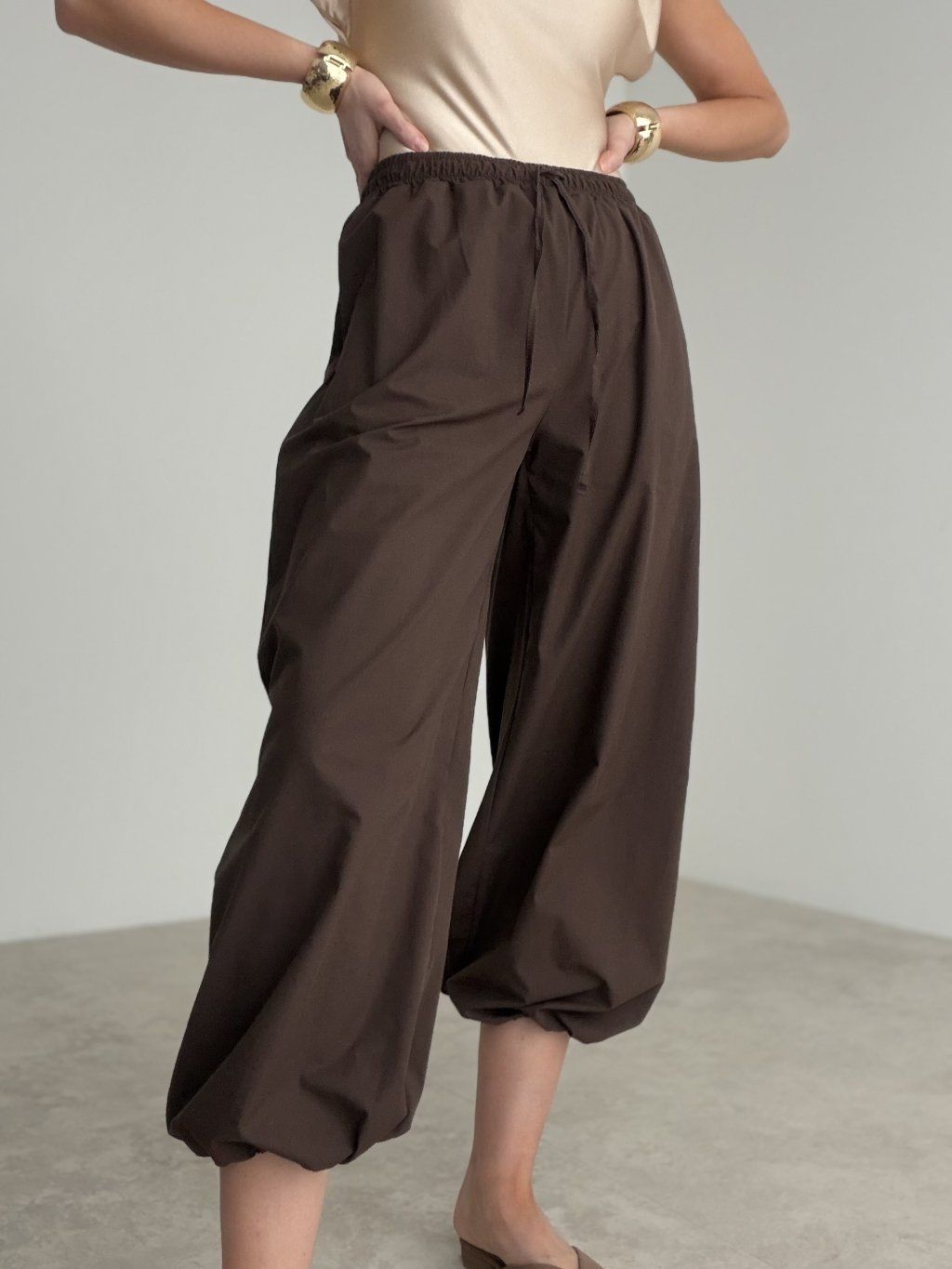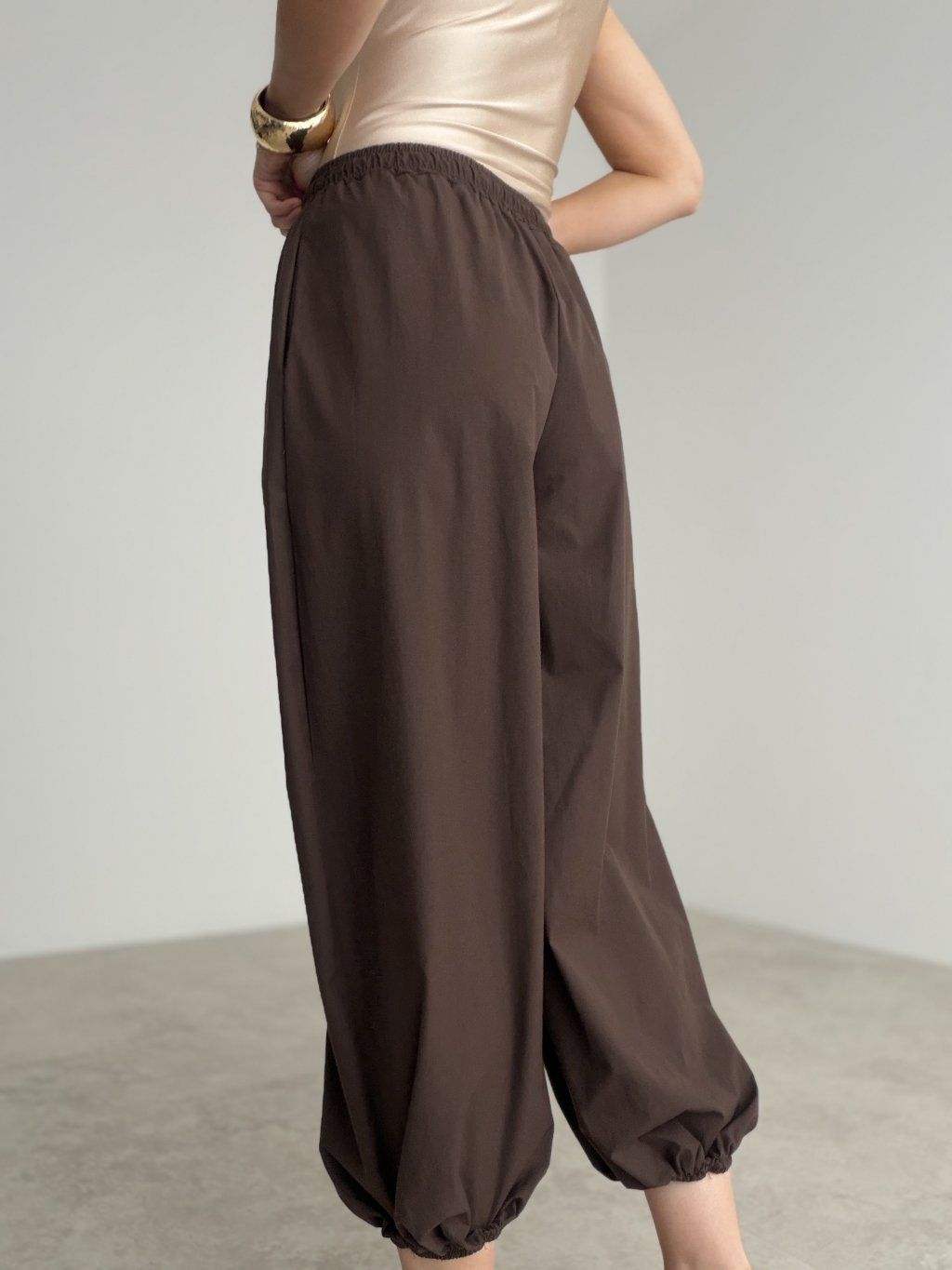 Original trousers with a relaxed fit, elastic waistband, and subtle gathered hem detail. A bold yet comfortable piece that brings a modern touch to any outfit.
