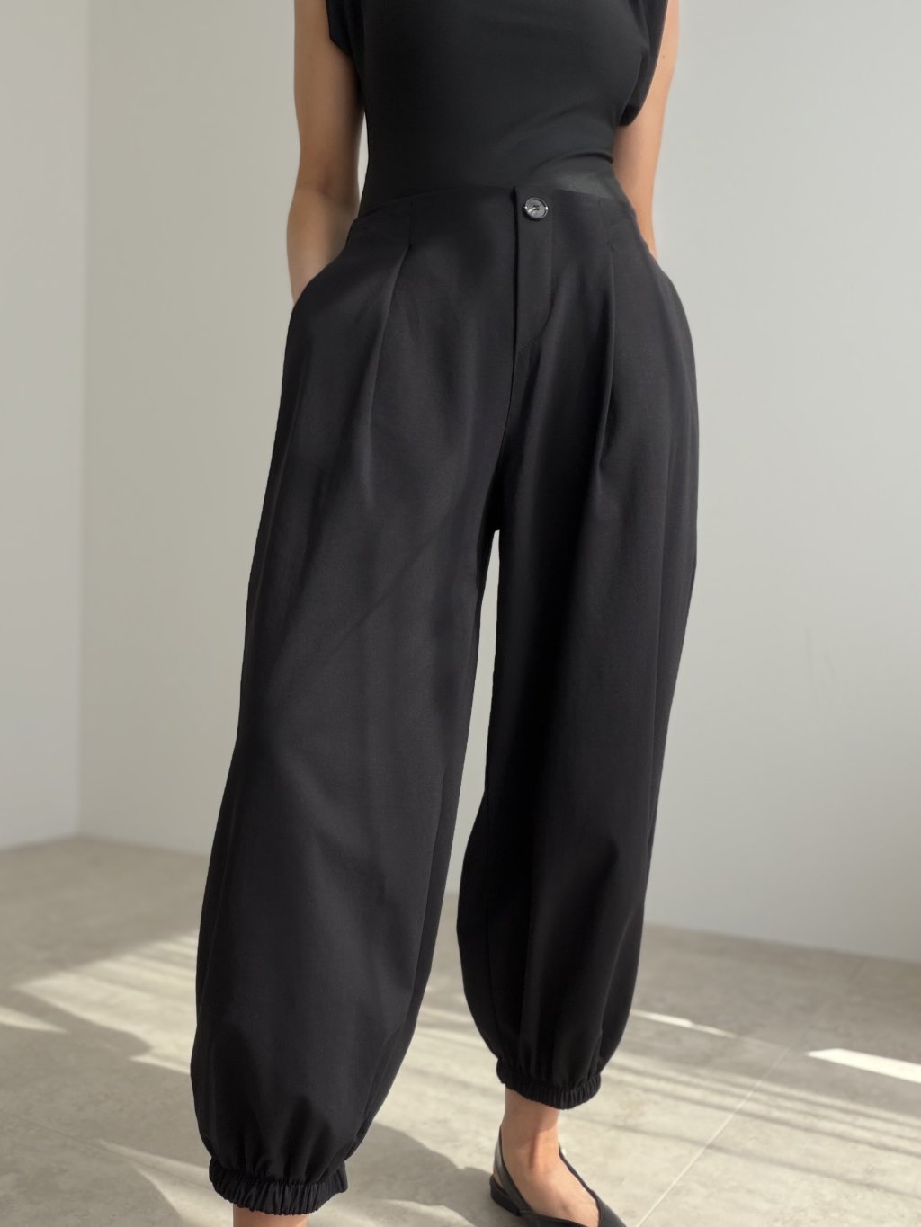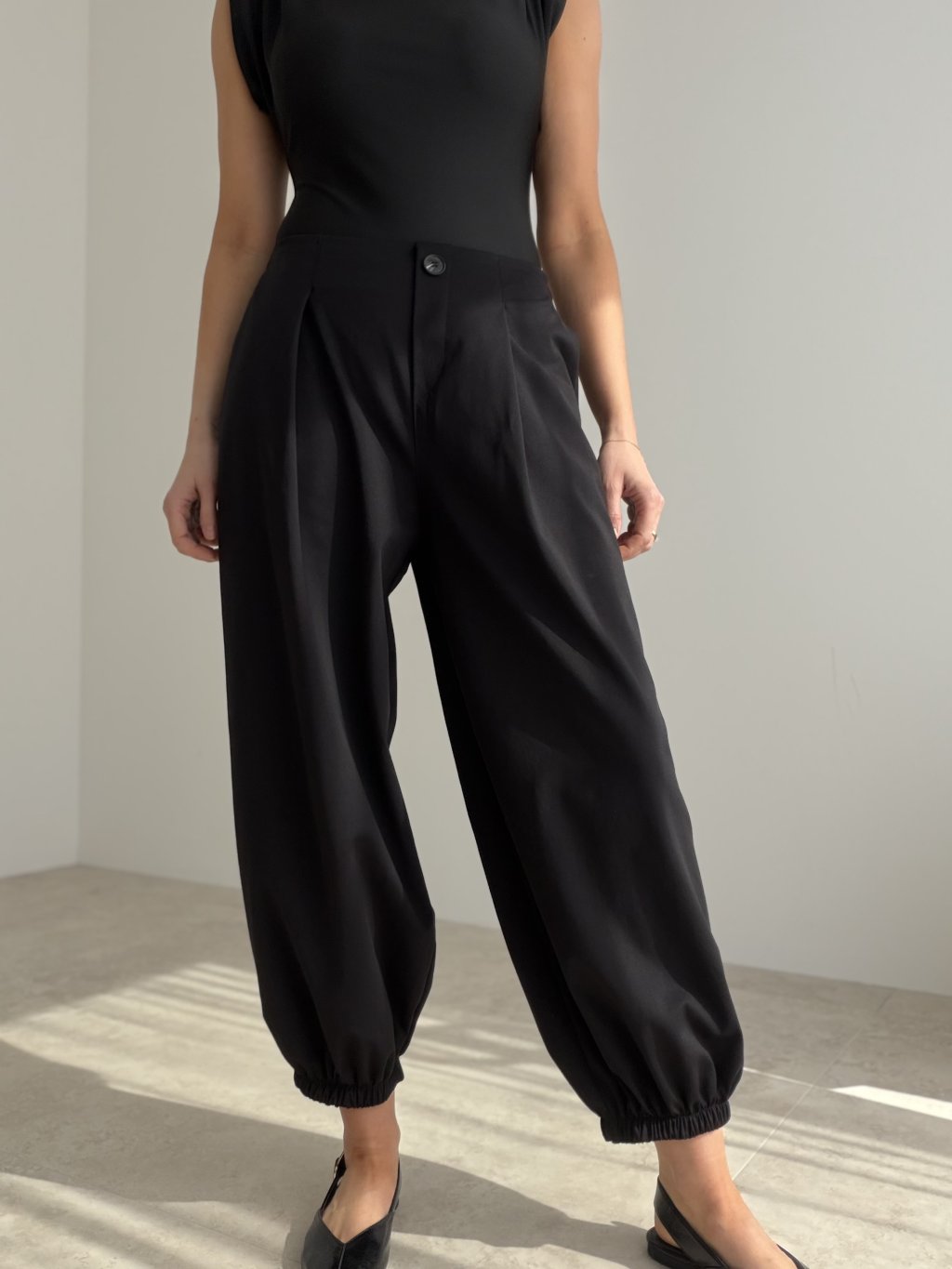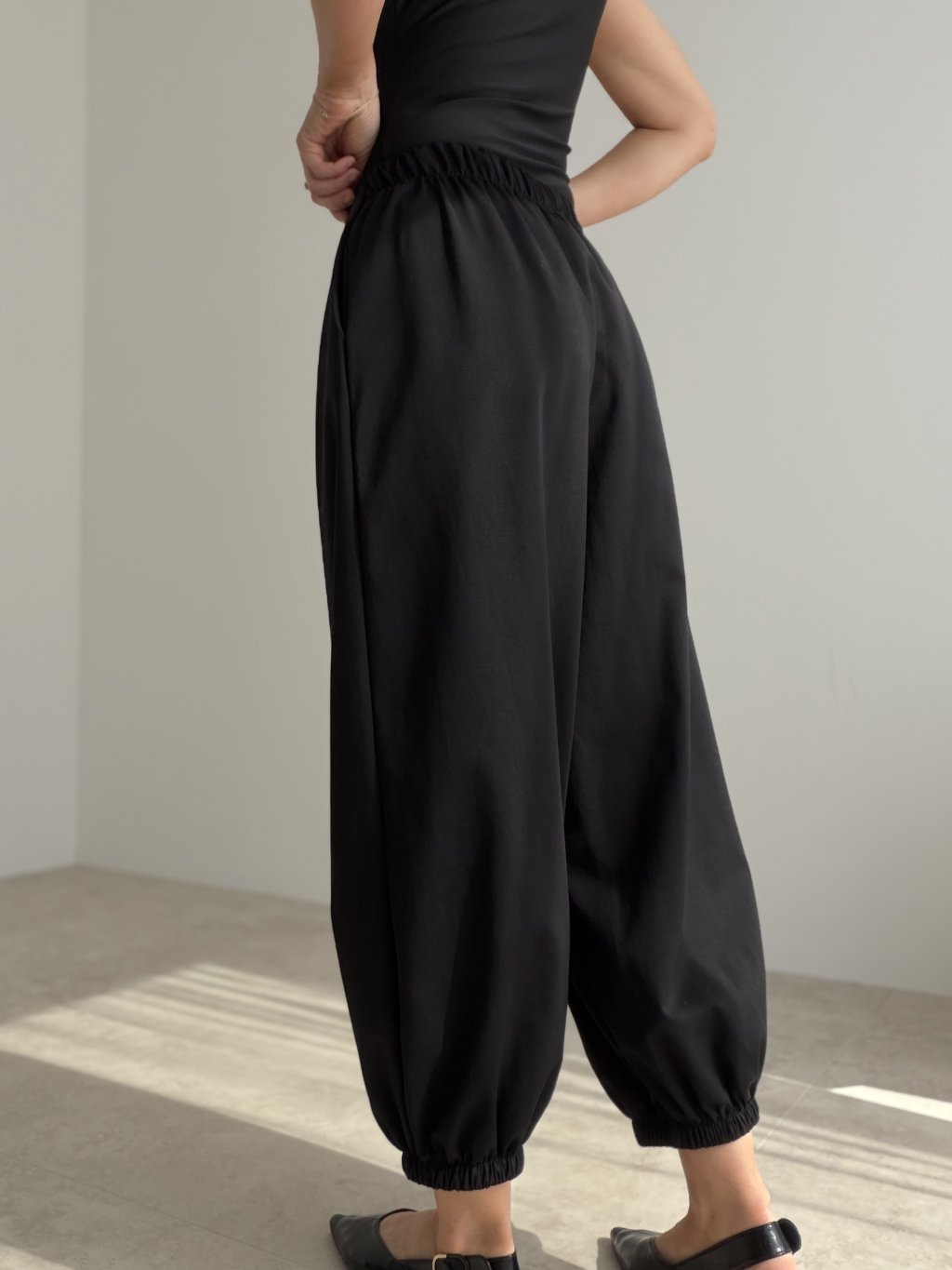 Cotton trousers with a modern cut and elasticated hems, perfect for everyday comfort and style. The elastic waistband at the back makes them easy to wear and flattering on the body.