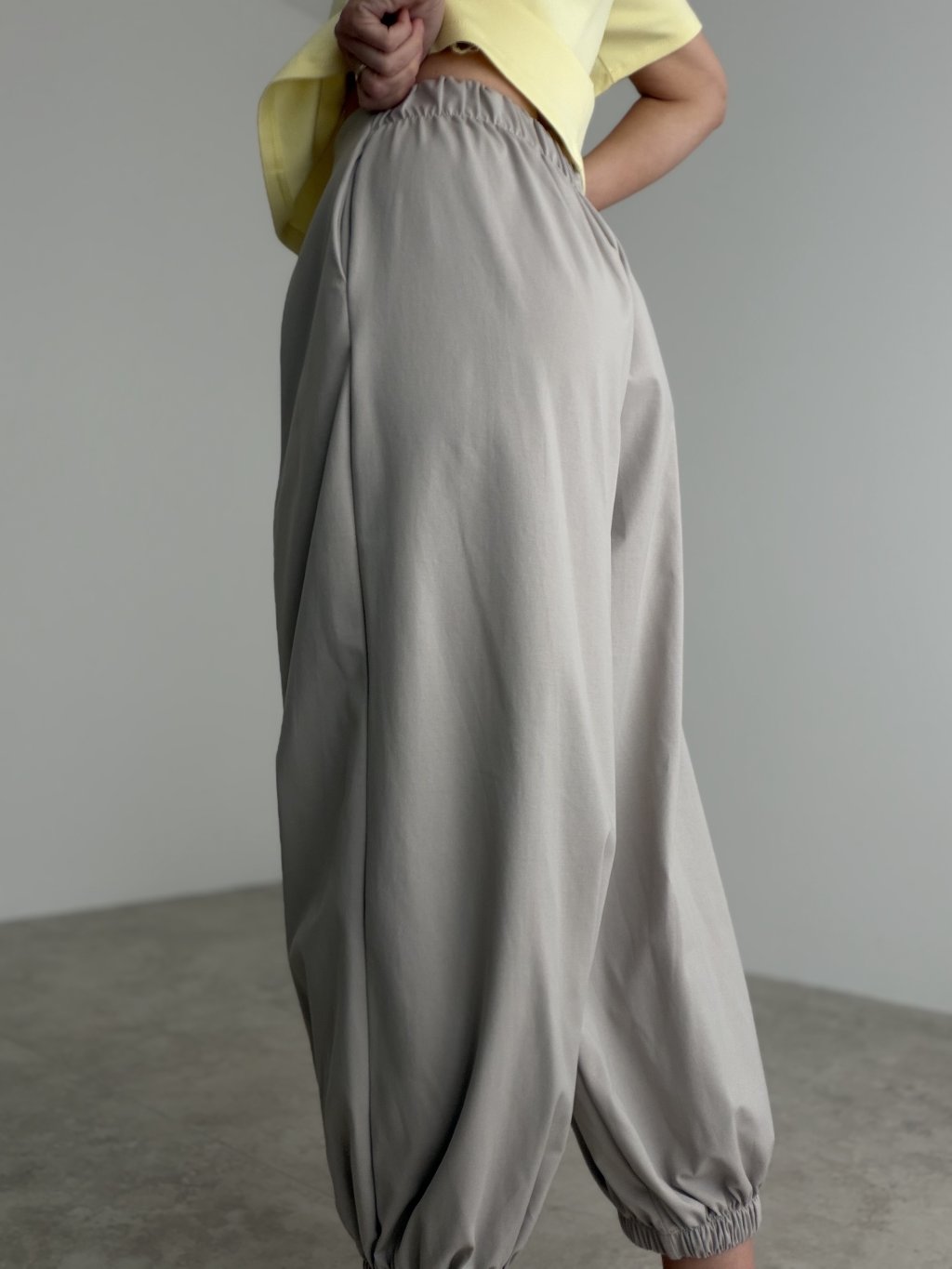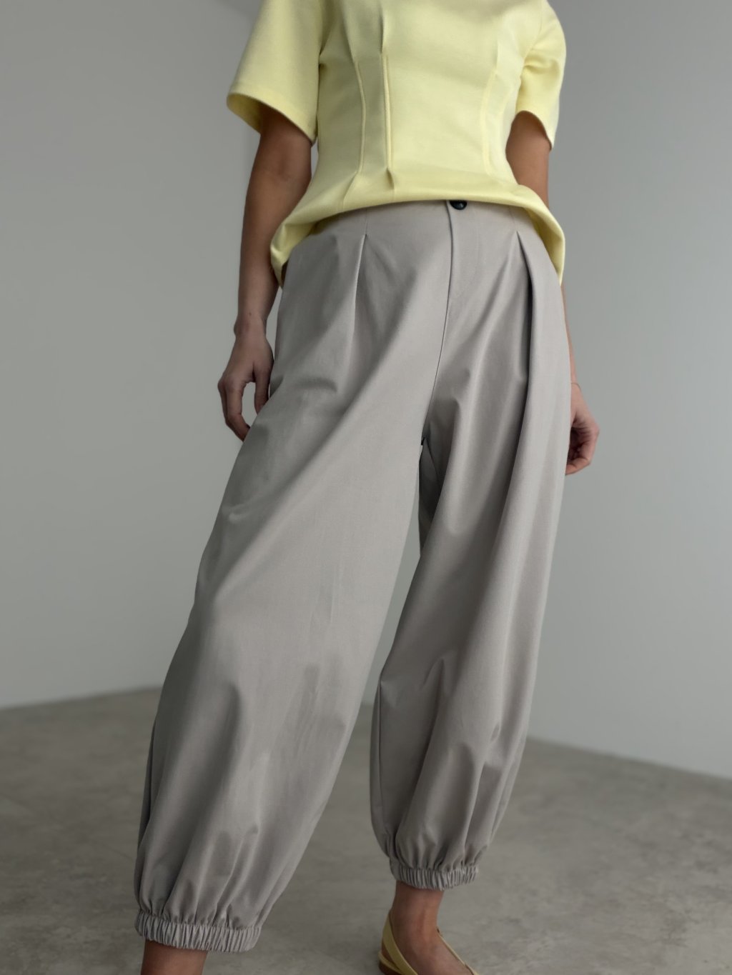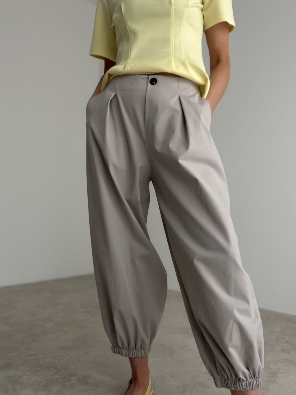 Cotton trousers with a modern cut and elasticated hems, perfect for everyday comfort and style. The elastic waistband at the back makes them easy to wear and flattering on the body.