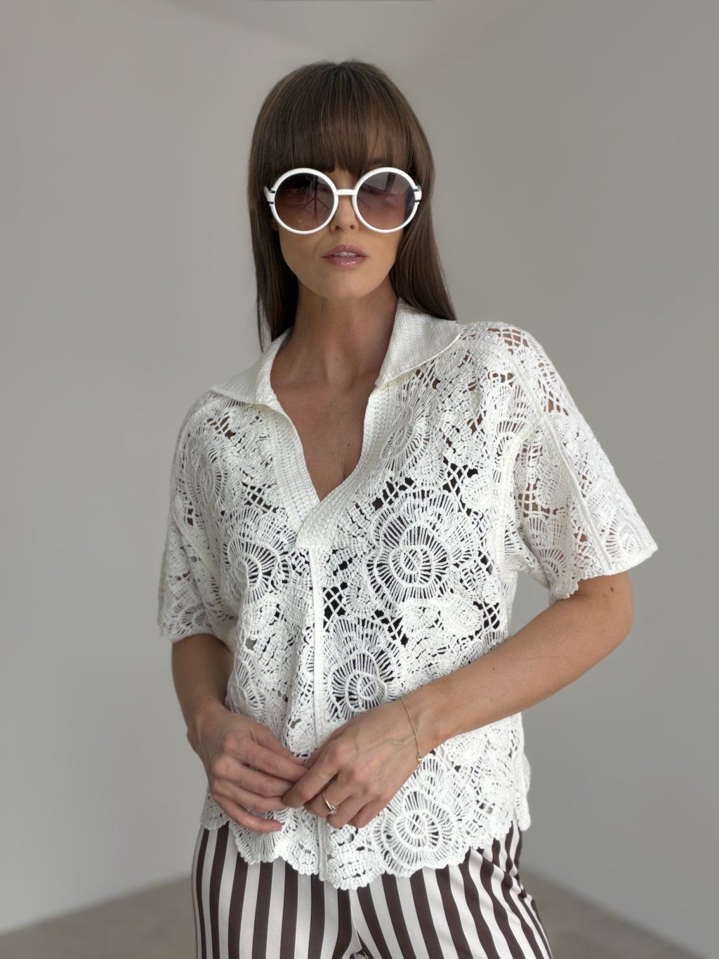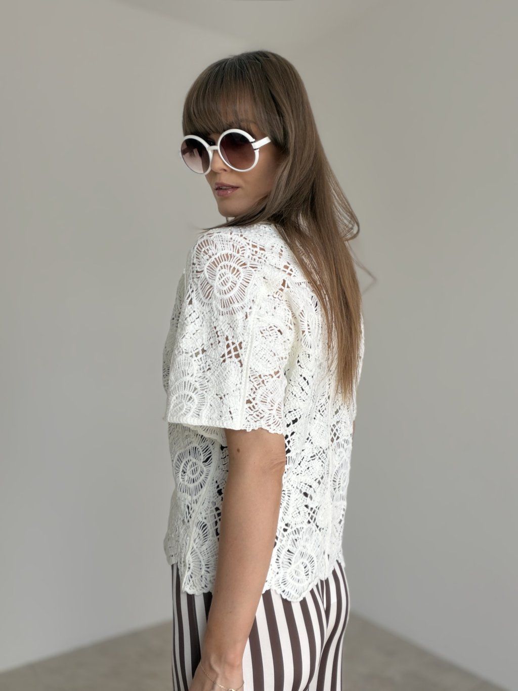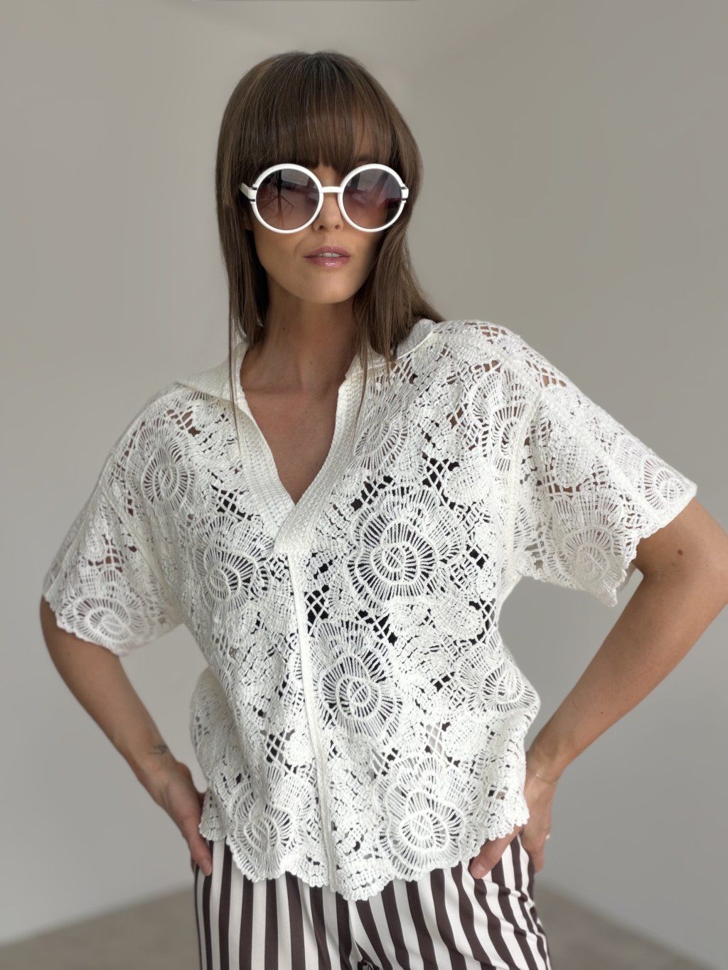 Airy crochet top with a relaxed fit, V-neckline and decorative openwork. Perfect for layering and warm-weather styling.