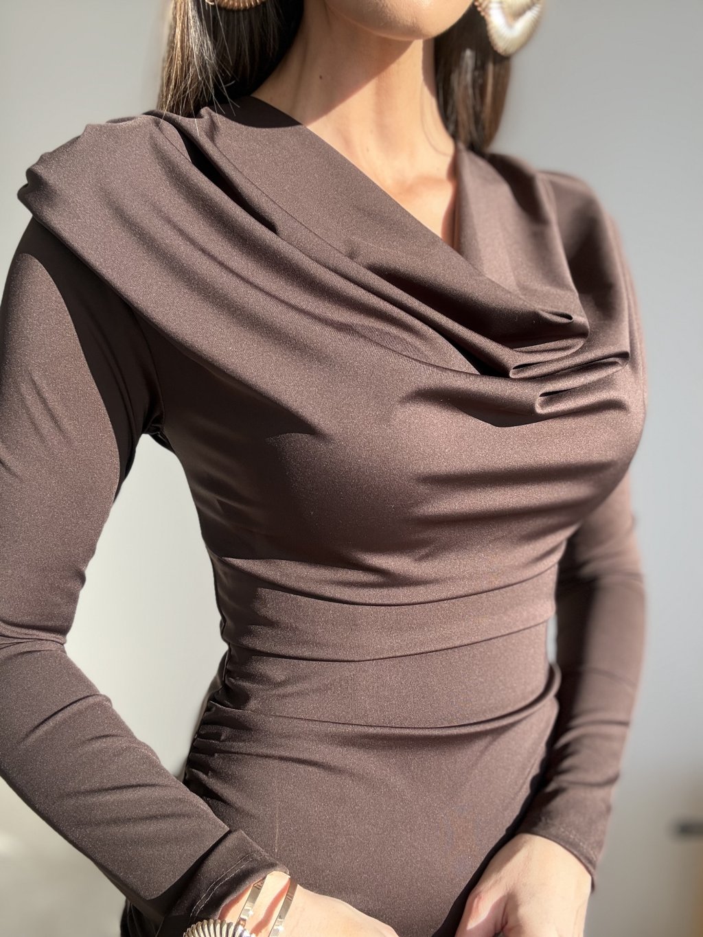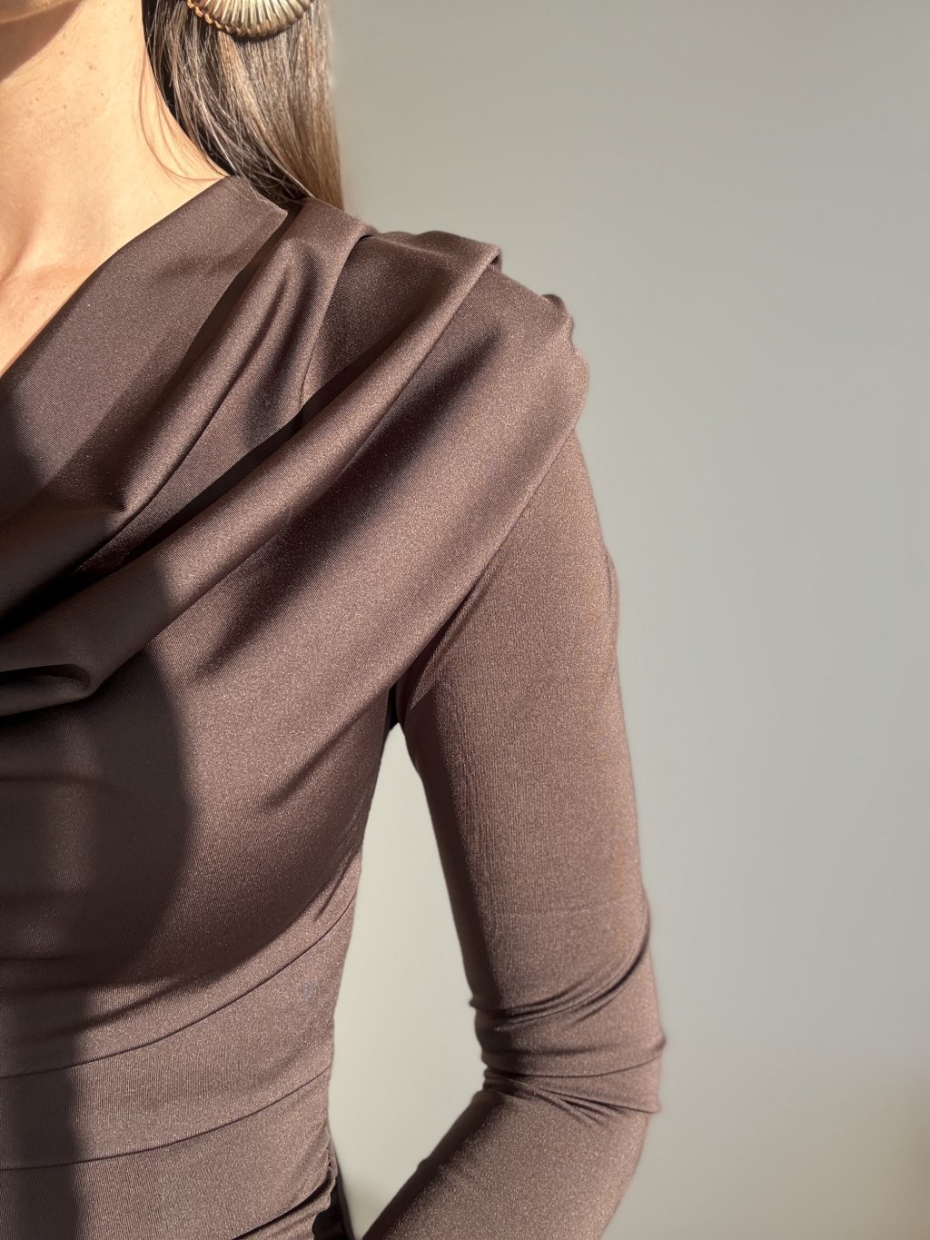 These shoulder-pad dresses offer an elegant, structured look that beautifully enhances the female silhouette. The fitted cut gently shapes the body, while the soft draping at the neckline adds a refined and luxurious touch. The shoulder pads define the shoulders, balance the proportions and create a modern, polished appearance.
