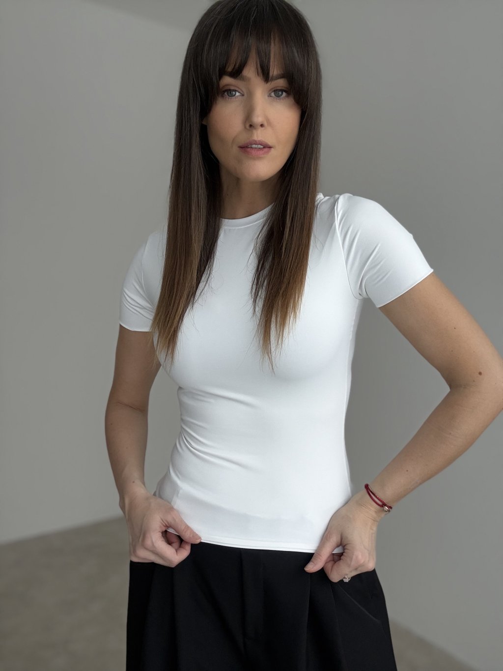 A fitted elastic top with short sleeves that beautifully highlights the silhouette. The smooth, soft-touch fabric adapts to the body and ensures all-day comfort. Its minimalist round-neck design makes it easy to pair with both elegant and casual outfits. A timeless essential for every wardrobe.