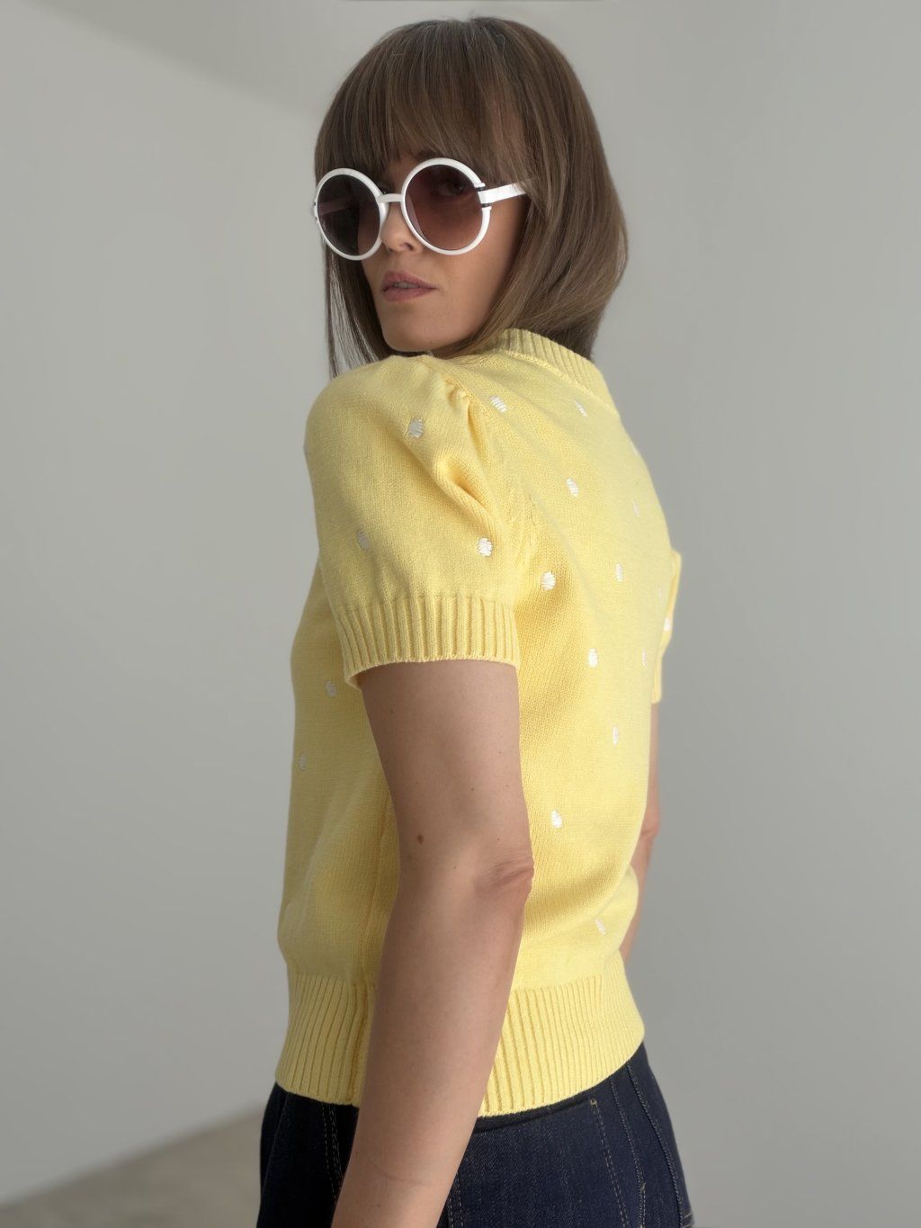 An embroidered short-sleeve sweater with a round neckline and soft knitted finish. A stylish and feminine piece for everyday wear.