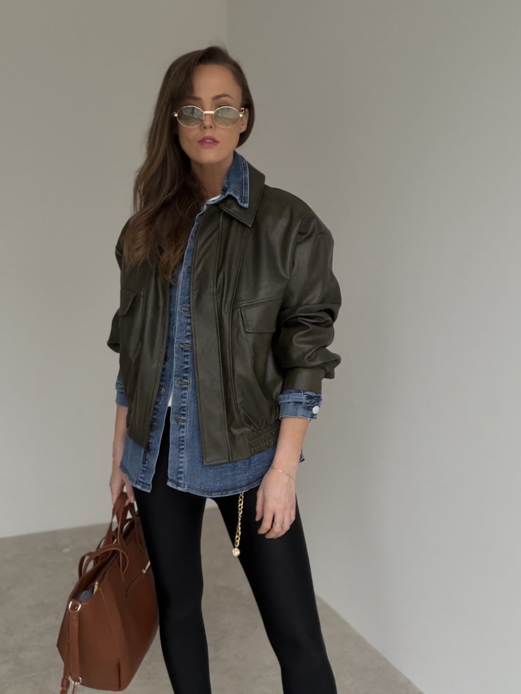 Create a refined contrast by styling it with softer fabrics like knitwear, satin or a lightweight blouse.