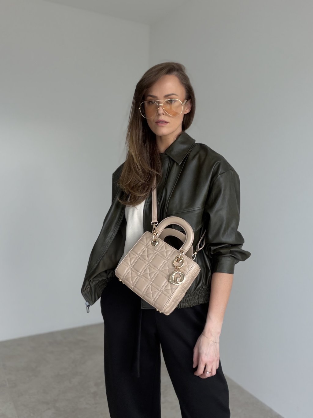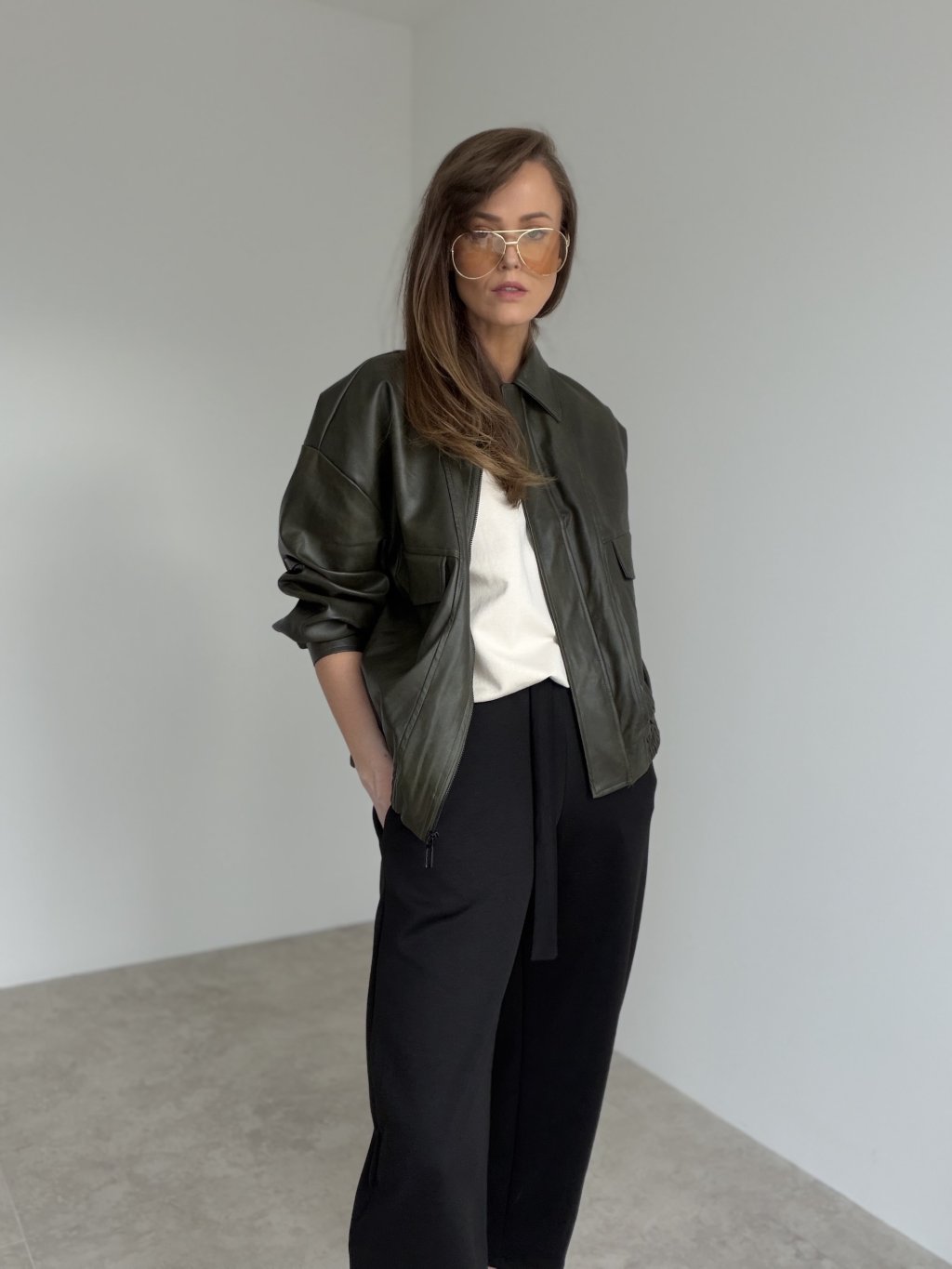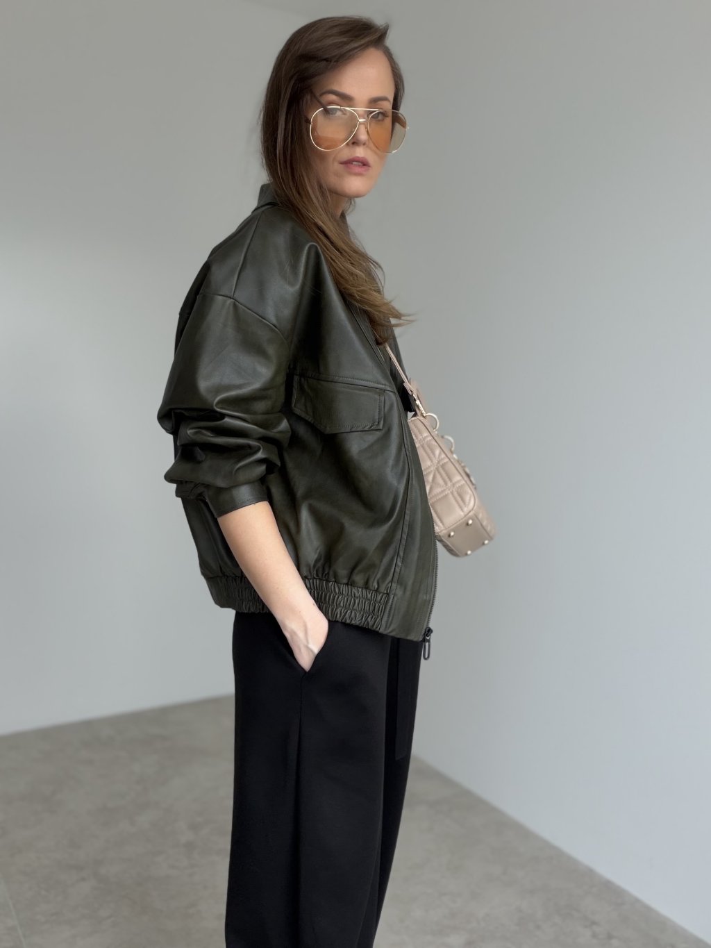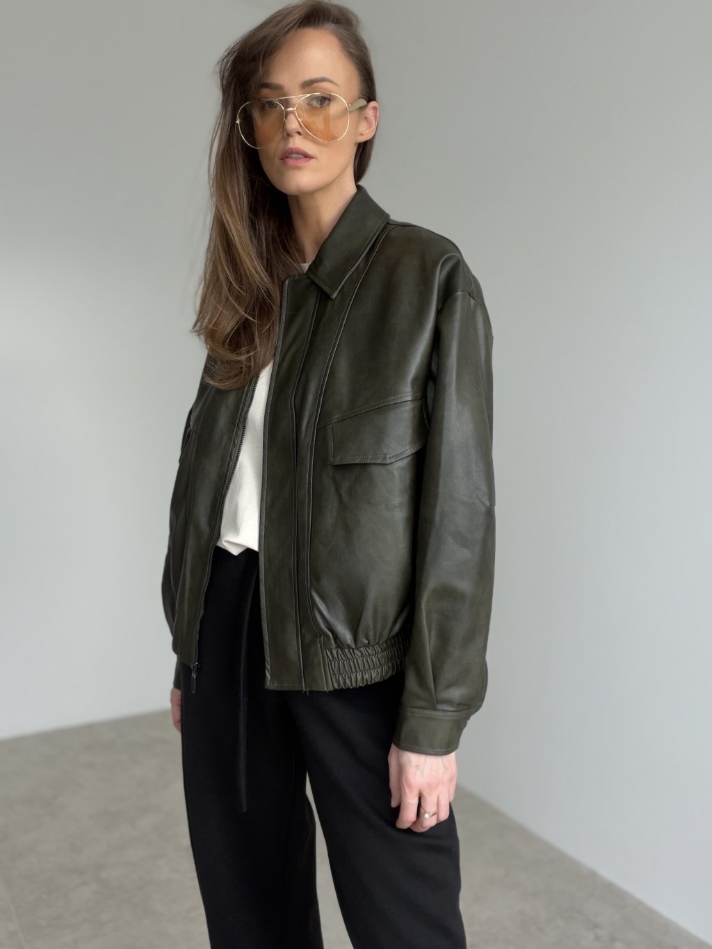 Modern faux leather jacket with a zip fastening, collar and practical pockets, designed to give any outfit a bold yet elegant finish.