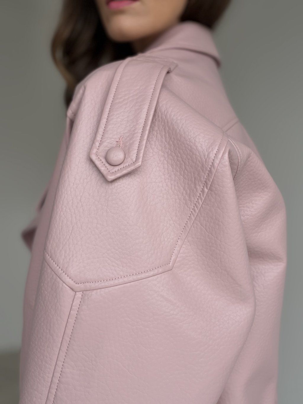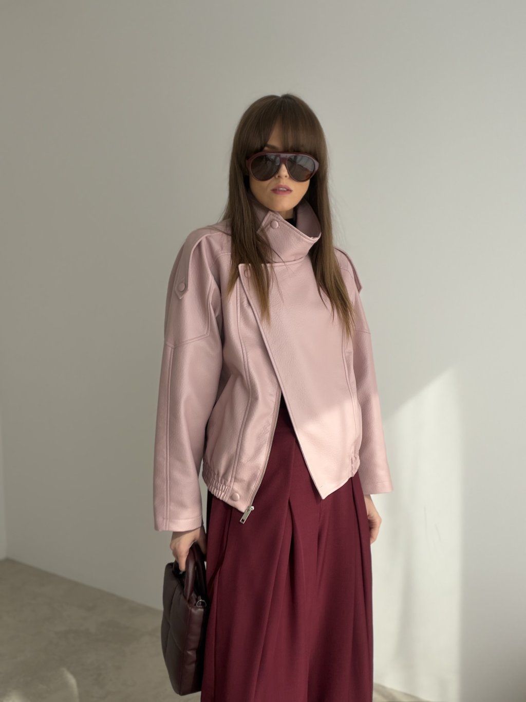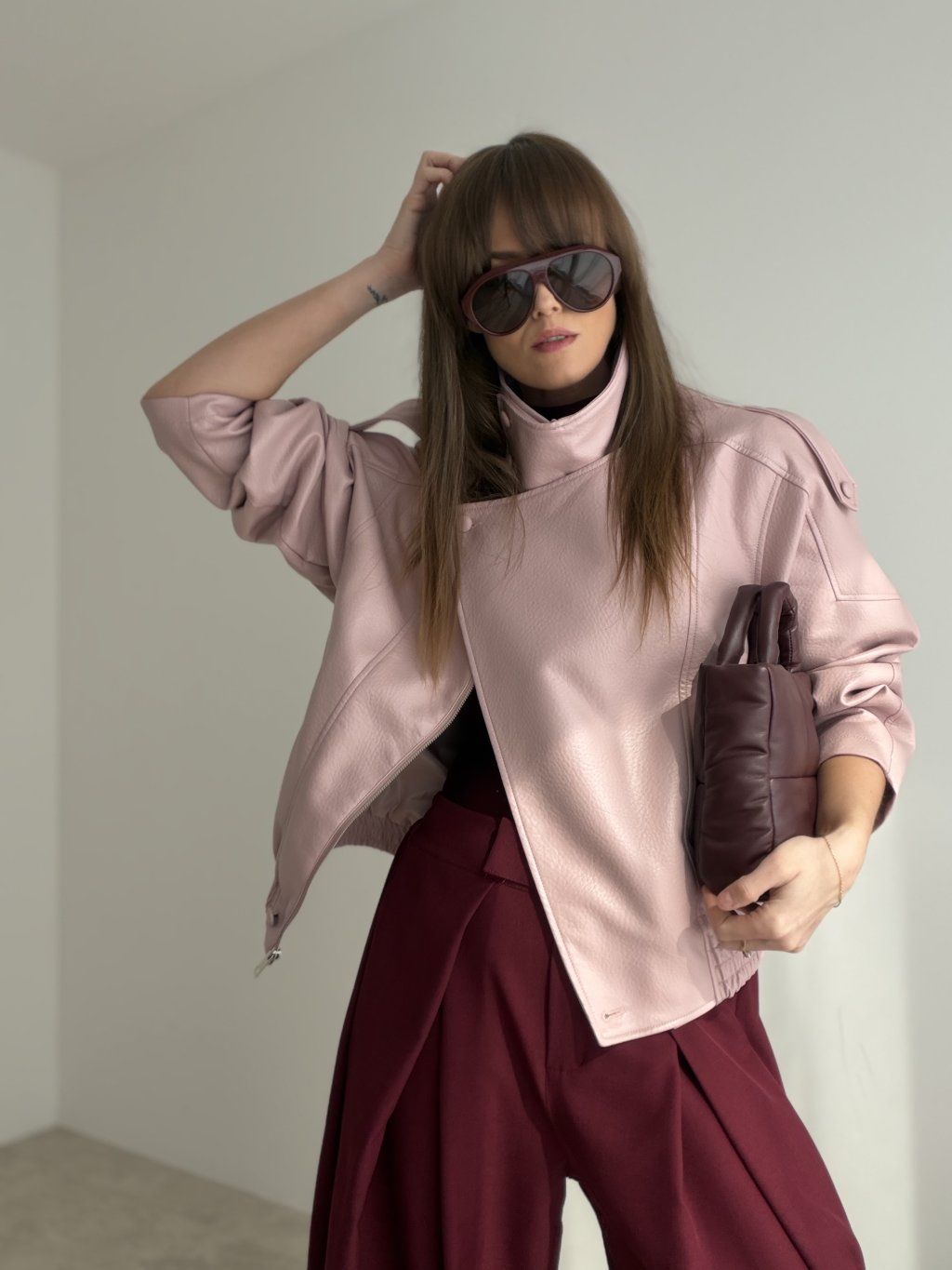 This faux leather jacket with a modern cropped cut is a statement piece that adds instant edge while still looking refined. The structured fabric with a subtle texture holds its shape and creates a polished silhouette. Standout details include a bold collar, gathered hem, and clean seam lines that give it a premium, well-designed feel. The fit is relaxed, making it easy to layer over a hoodie or a thicker top, and it pairs effortlessly with denim, dresses, or sporty looks.