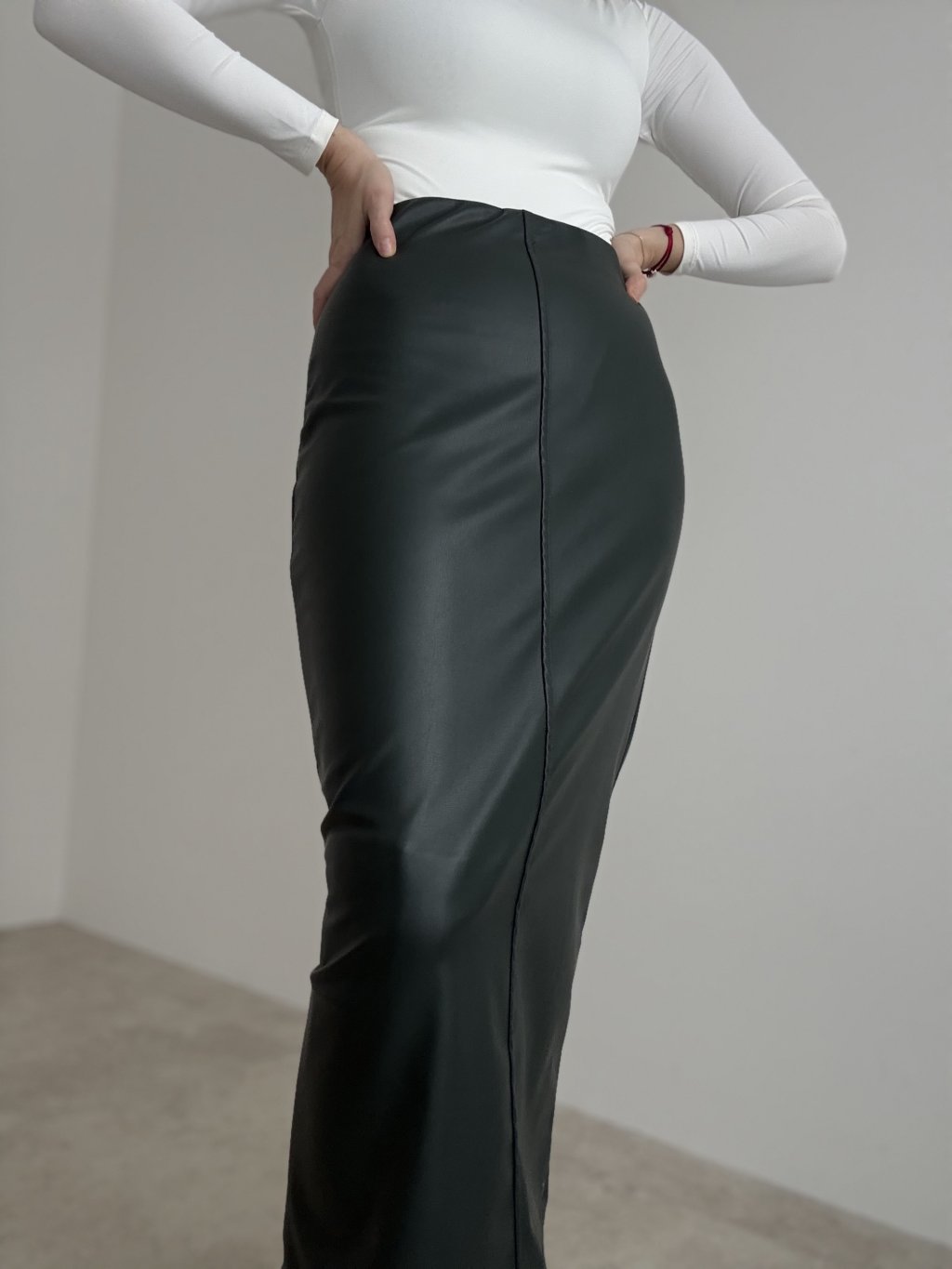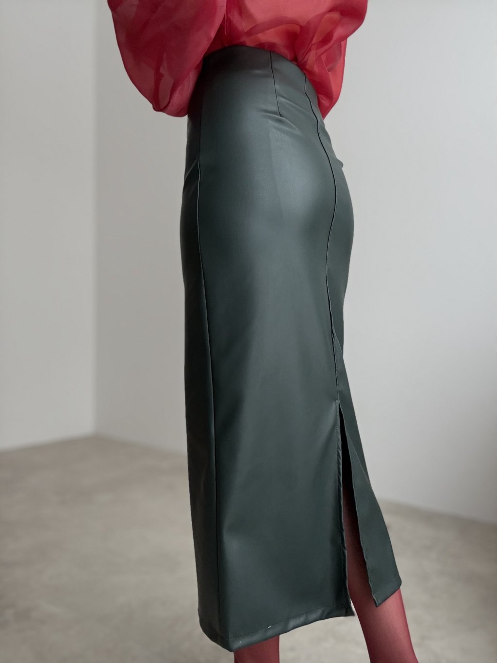 Midi faux leather skirt with a high waist and a back slit for comfortable movement.