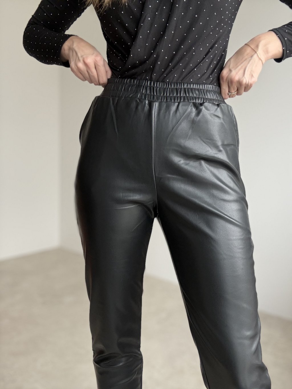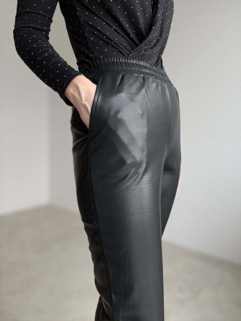 Faux leather trousers with an elastic waistband, pockets and a straight leg, combining the comfort of joggers with a sleek, modern look.