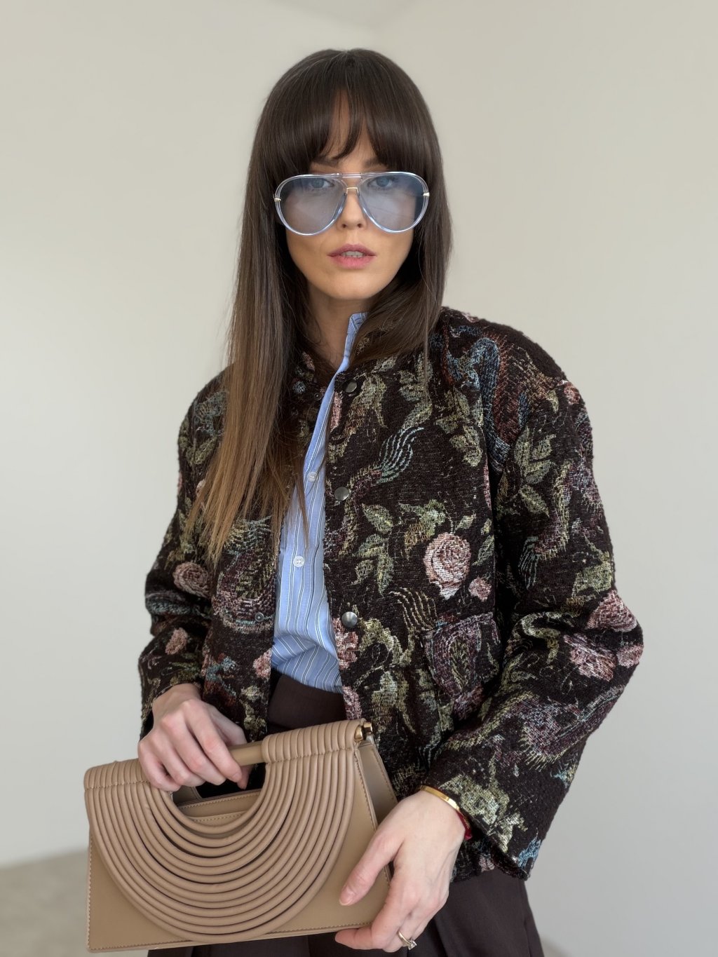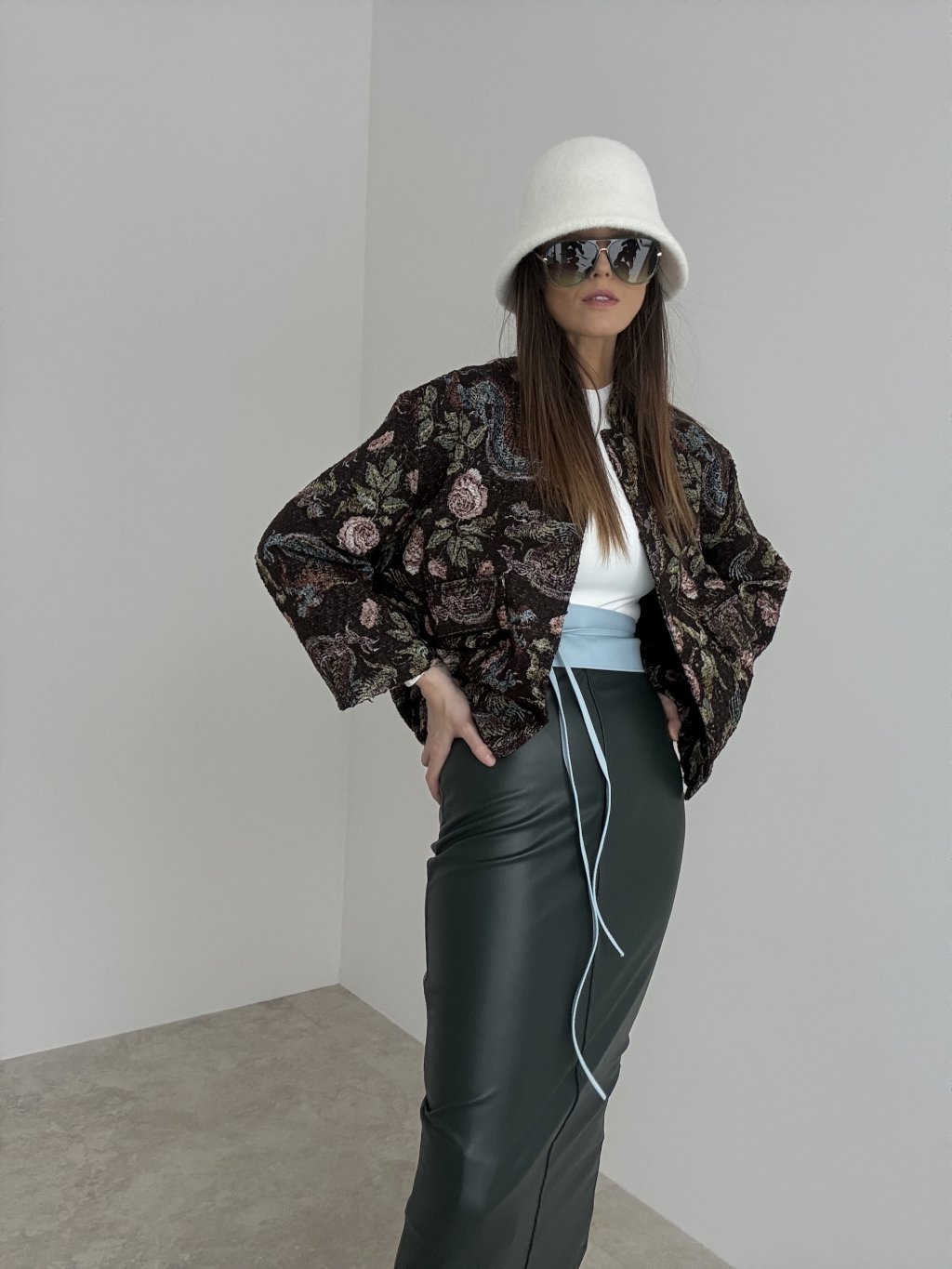 It pairs beautifully with simple basics—T-shirts, turtlenecks, shirts—allowing the jacket’s character to stand out. It works especially well with high-waisted skirts or trousers, enhancing the silhouette and giving a refined finish. A true throw-on piece that makes everyday styling feel fashionable with minimal effort.