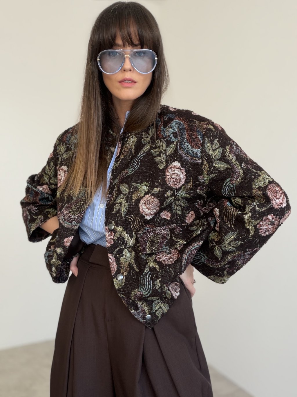 This jacket is a statement yet elegant piece that instantly makes any outfit look complete. It features a modern cropped silhouette and a structured, textured fabric with a rich pattern that feels elevated and original. Button fastening and practical pockets add both style and function. It’s perfect for transitional days when you want to layer effortlessly while still looking polished.