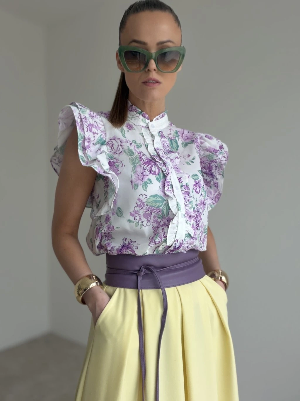This blouse feels romantic, feminine and elegantly refined. The delicate floral pattern combined with statement ruffled sleeves and a decorative front detail creates a sophisticated piece that instantly stands out. The higher neckline adds a polished and tasteful finish, making it suitable not only for everyday wear but also for moments when you want to look especially stylish and put together.