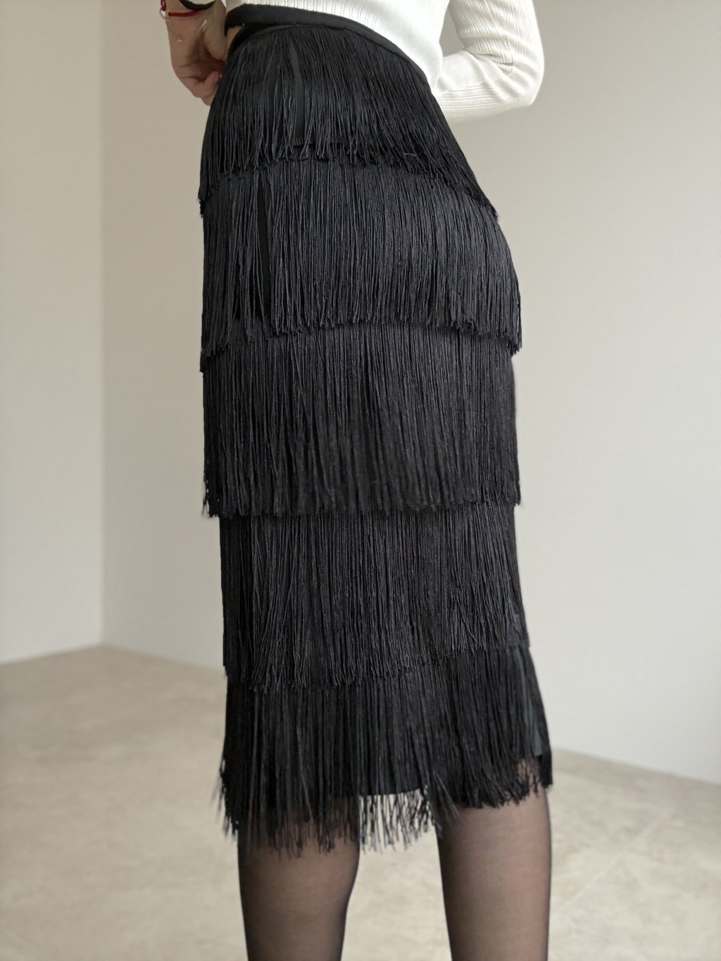 Midi fringe skirt with multiple tiers of flowing fringes and a smooth waistband that flatters the figure. A statement piece for parties, celebrations and standout evening looks.