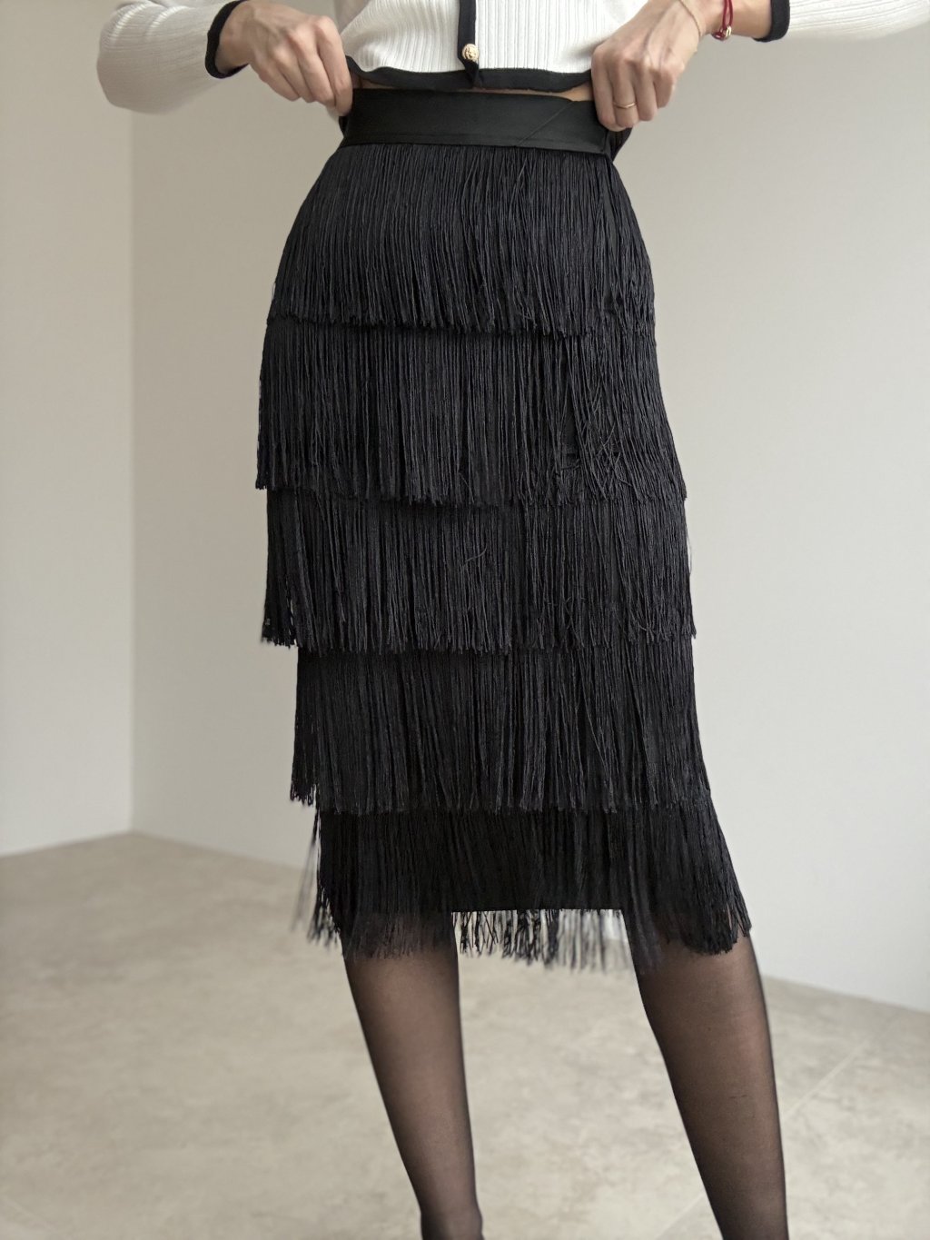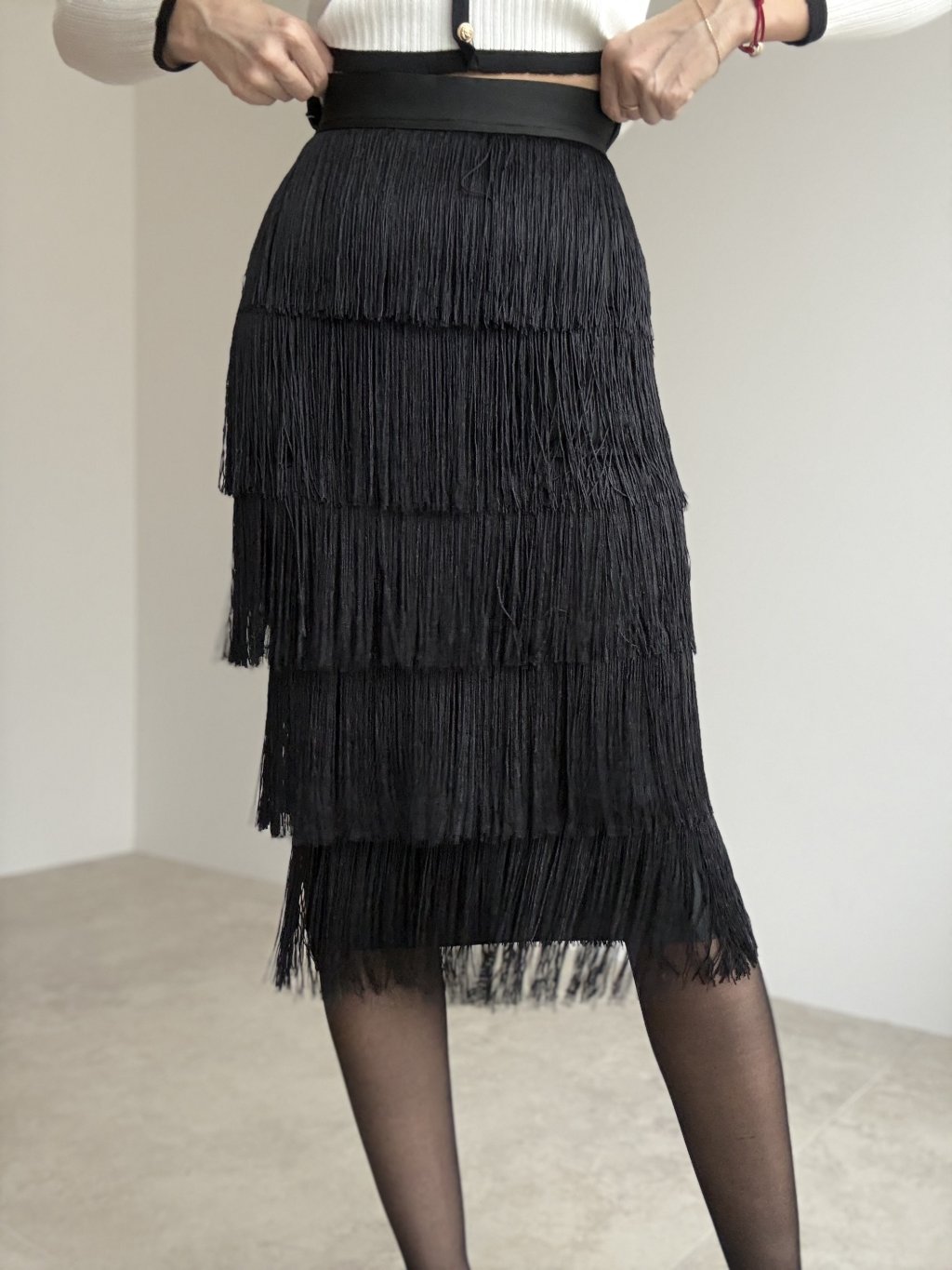 A fringe skirt with multiple tiers of fine, flowing fringes creates a striking, dynamic look that moves beautifully with every step. The smooth waistband gently defines the waist and elongates the silhouette, while the layers of fringes softy skim over the figure and add a touch of dance-inspired glamour. The midi length feels feminine and sophisticated, perfect for parties, celebrations or a statement evening outfit in the city. It pairs effortlessly with a simple top or blouse, letting the playful detail at the bottom take center stage.