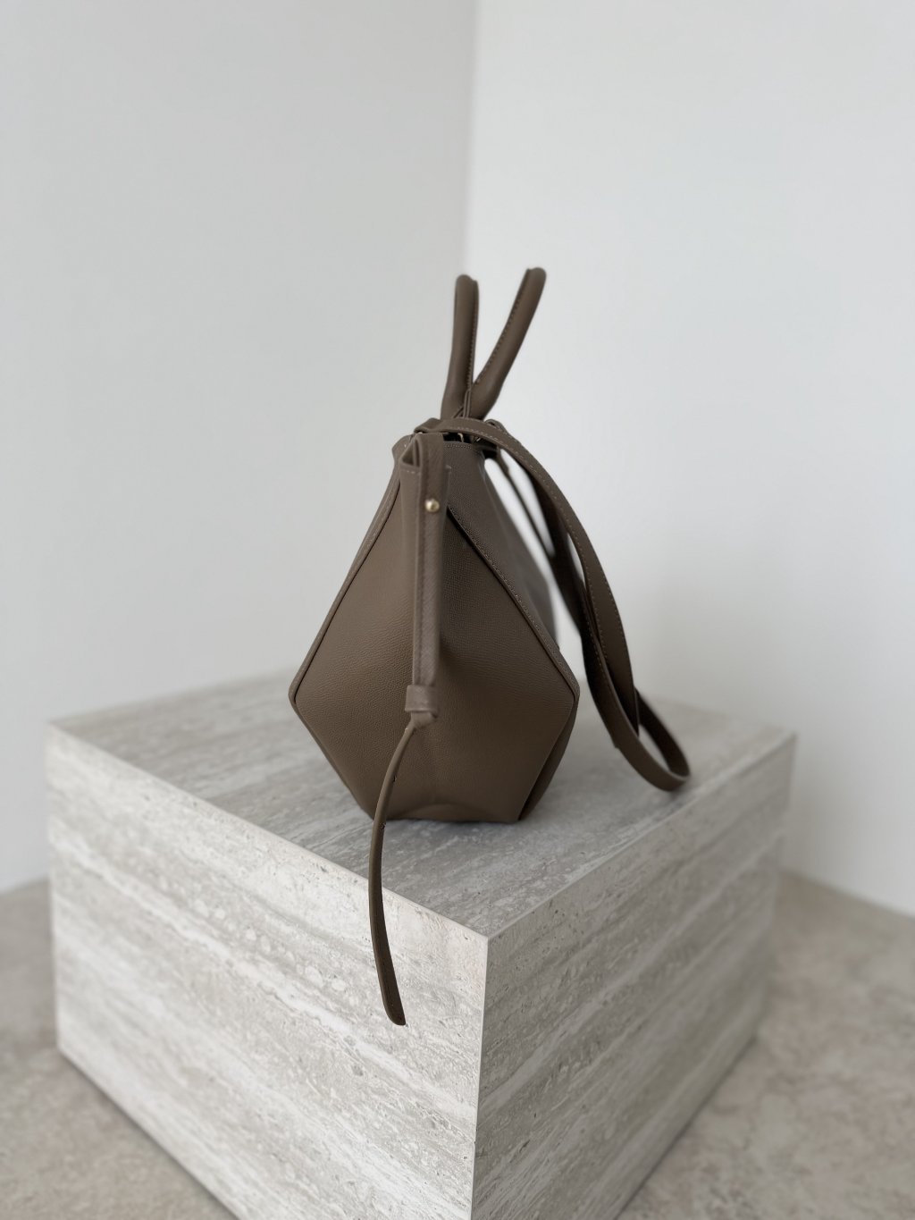 If wearing it on your shoulder, let the longer strap sit naturally and adjust the handles so the shape stays structured.