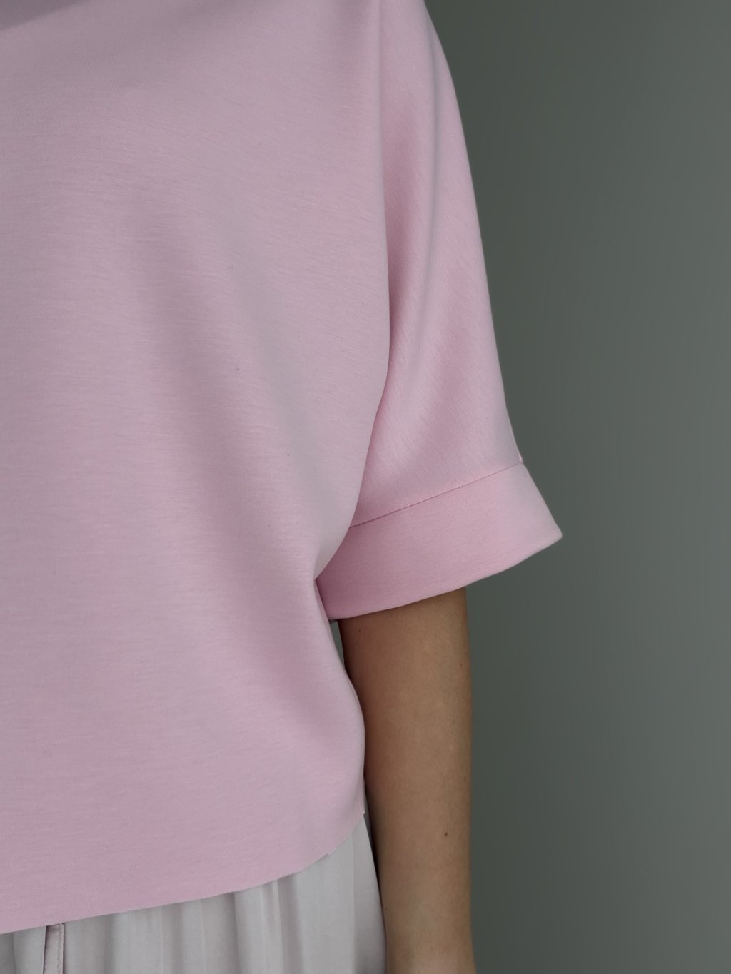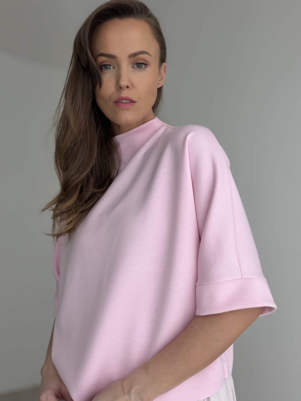 A relaxed high-neck top with wider cuffed sleeves for a clean, modern look that’s easy to style.
