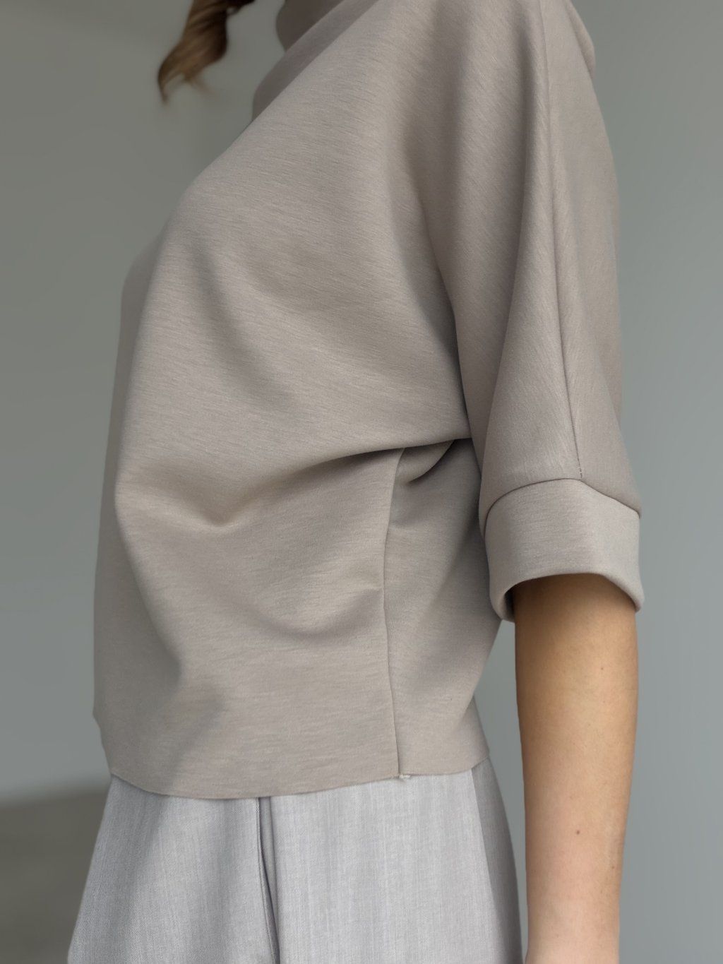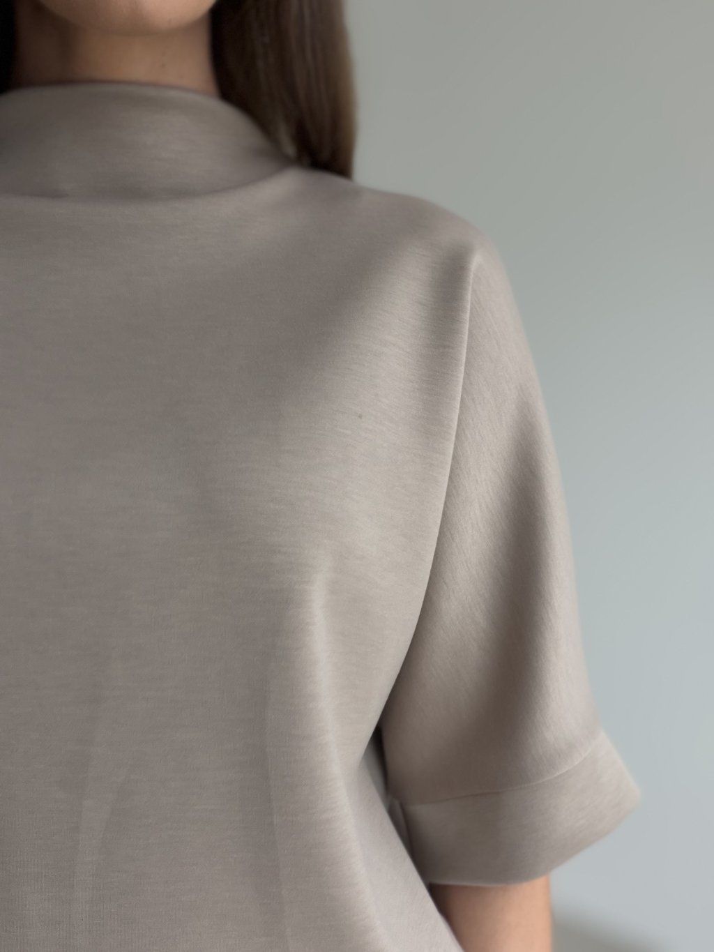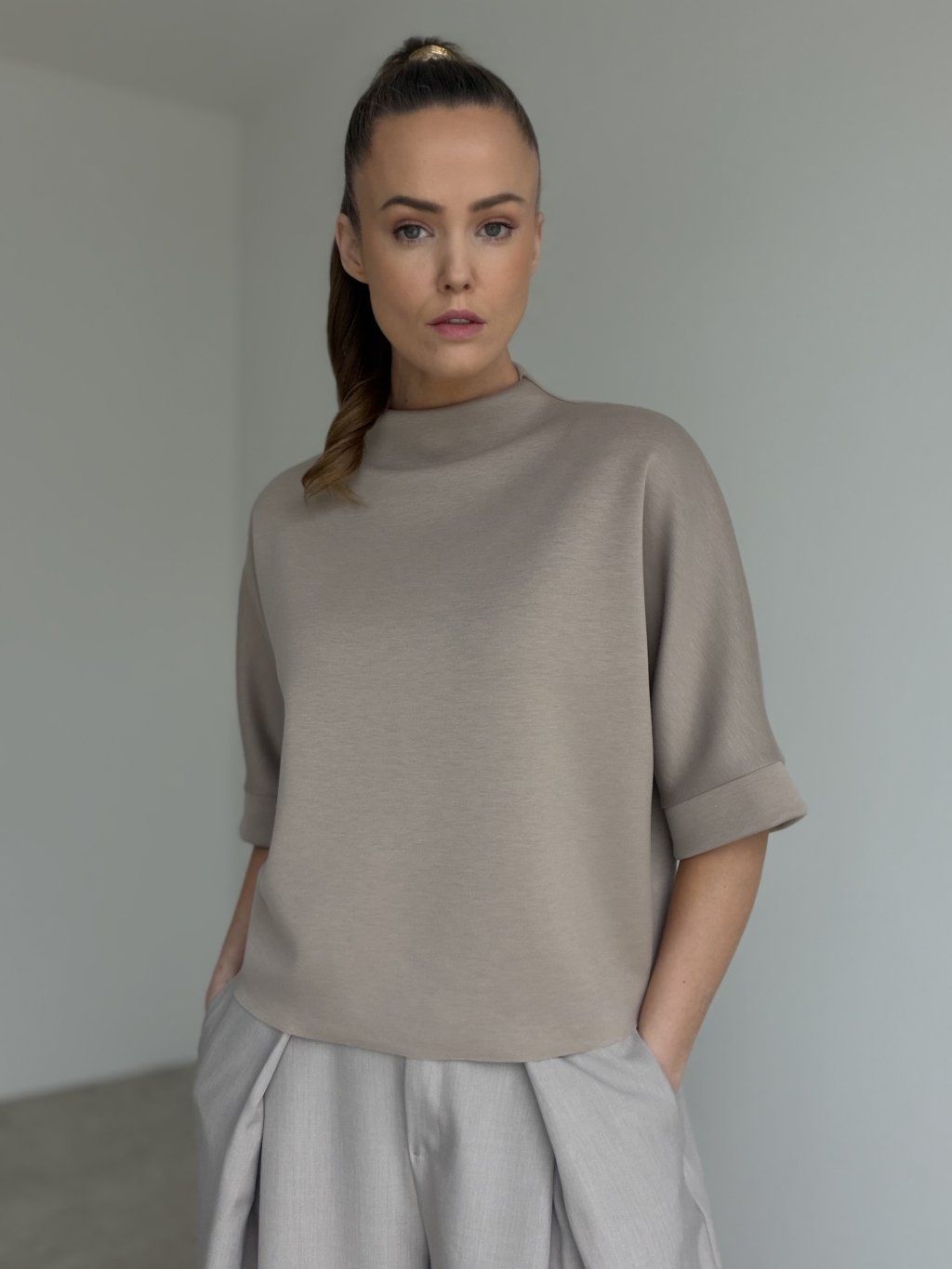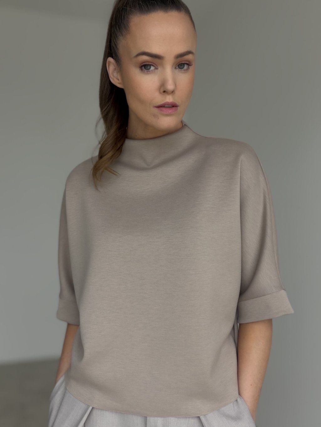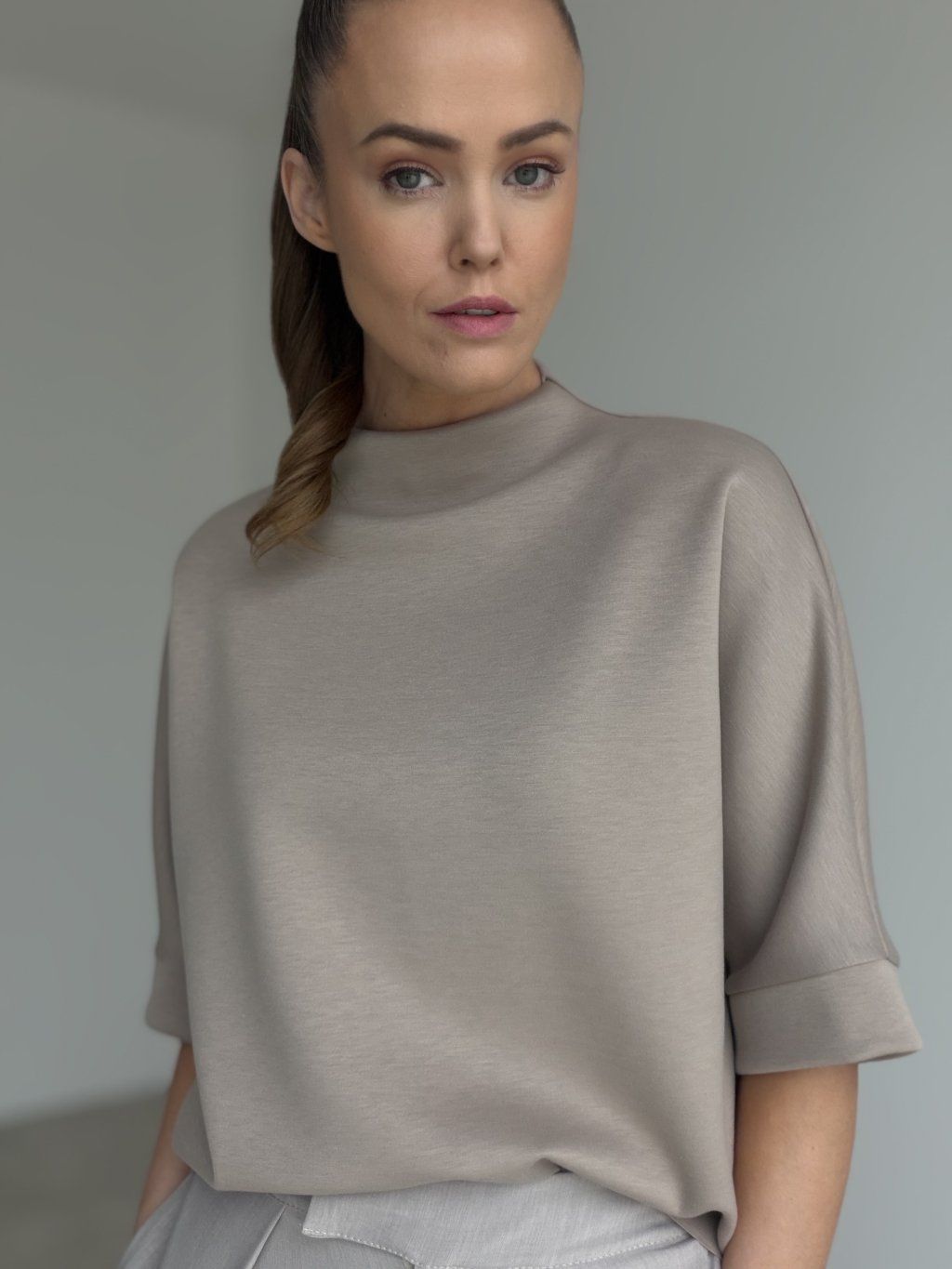 A relaxed high-neck top with wider cuffed sleeves for a clean, modern look that’s easy to style.