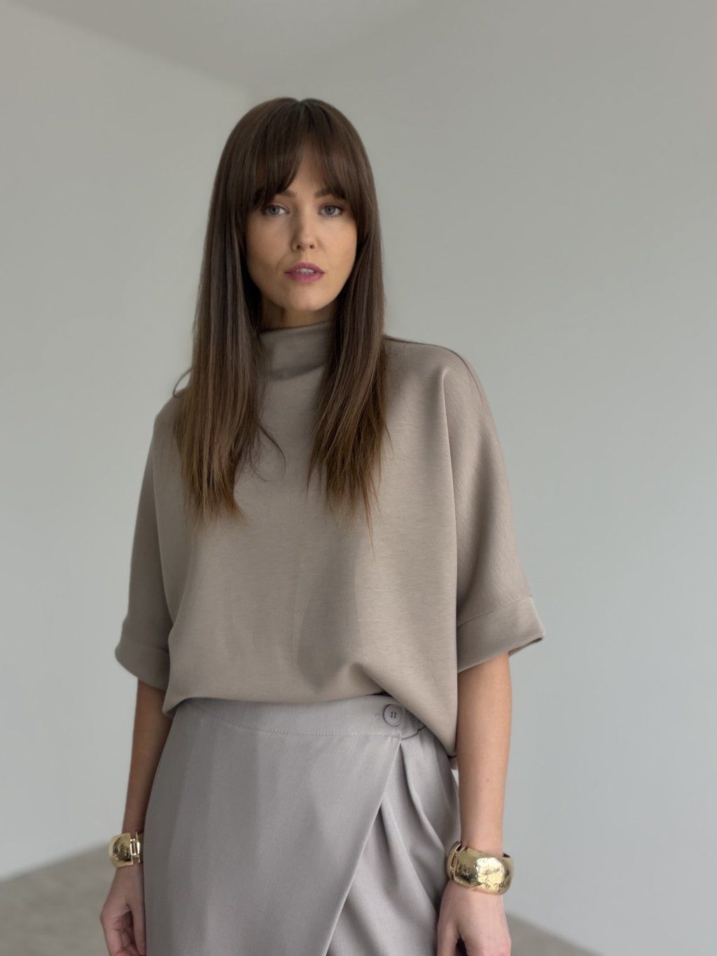 This high-neck top is a timeless piece that feels elegant yet effortlessly modern. It features a relaxed silhouette with a gently dropped shoulder and wider sleeves finished with a cuff detail, creating a clean, polished look without needing much styling. The high neckline holds its shape and adds a refined line, making the top easy to pair with wide-leg trousers, skirts, or layered under a blazer. Perfect for everyday wear, work, or any moment when you want a minimal but chic outfit. Soft, pleasant material, prone to snagging.
