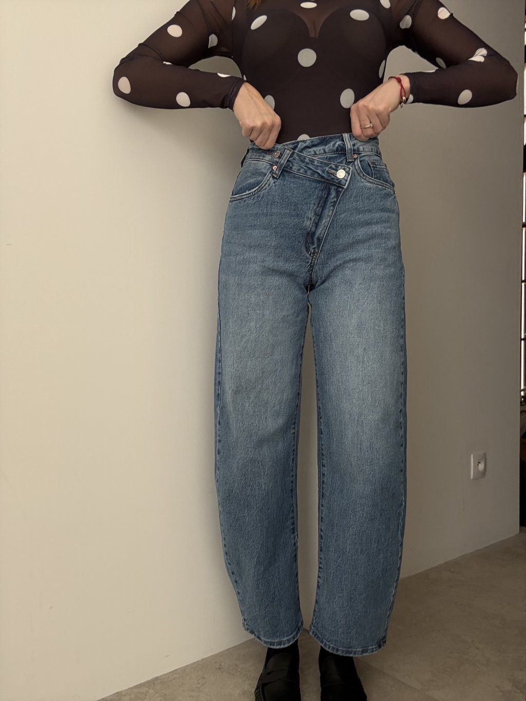 These jeans are a perfect take on a modern silhouette—shaping in the right places while still feeling relaxed. The high waist sits beautifully, visually elongates the legs, and defines the waist, while the distinctive fastening detail adds a fashion-forward touch. The straighter, wider leg feels comfortable all day and pairs effortlessly with fitted tops, shirts, or a blazer.