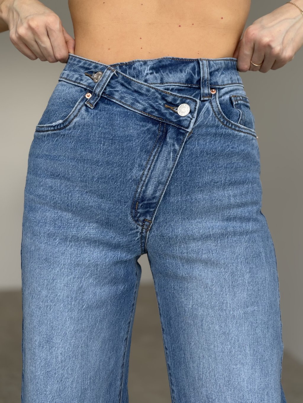 High-waisted jeans with a straight, wider leg and a standout fastening detail. Flattering, comfortable, and easy to style.