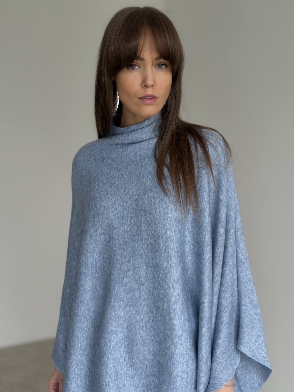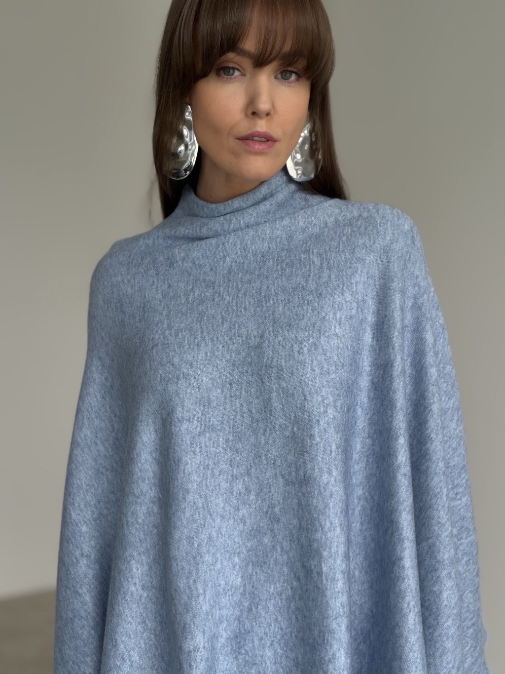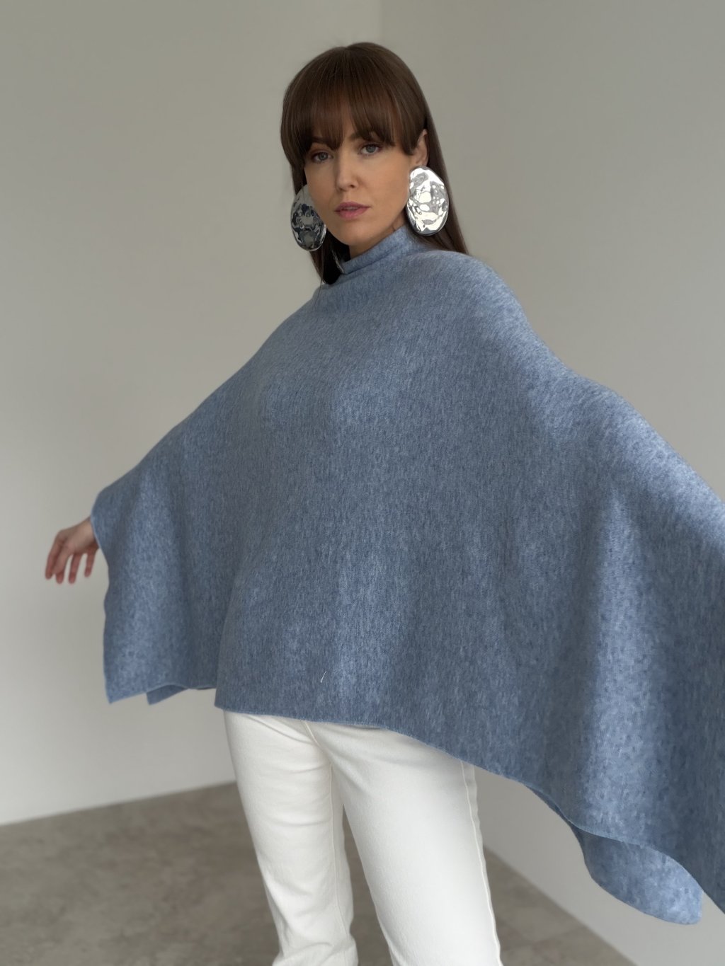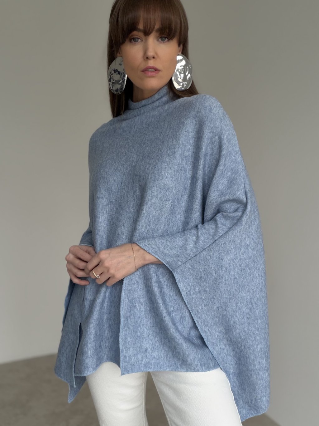 Draped knit poncho with a higher neckline and a relaxed fit, perfect for effortless layering.