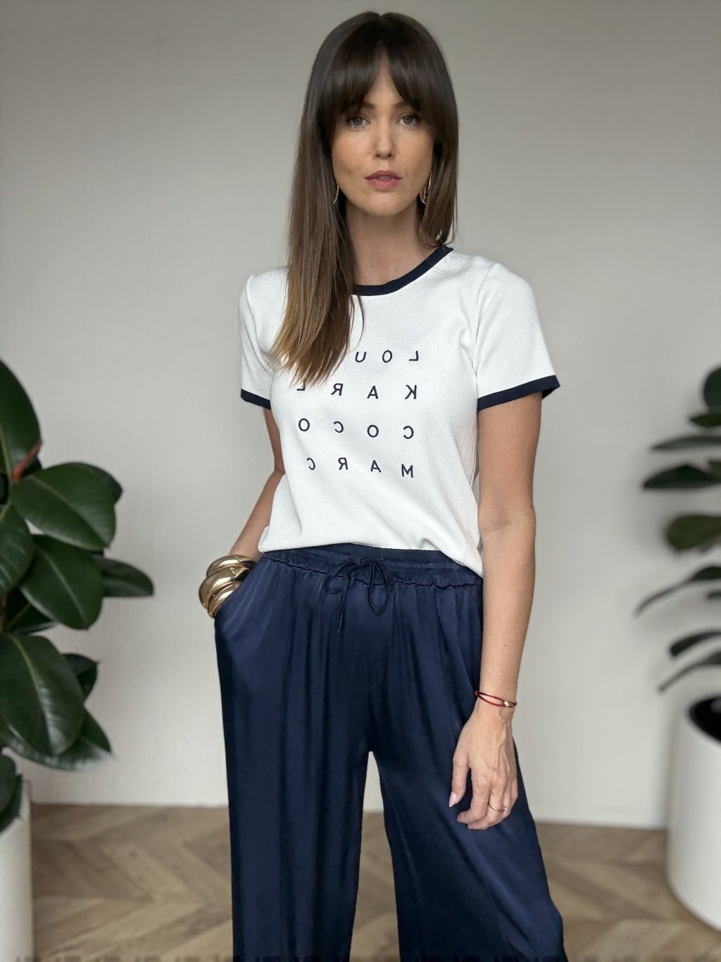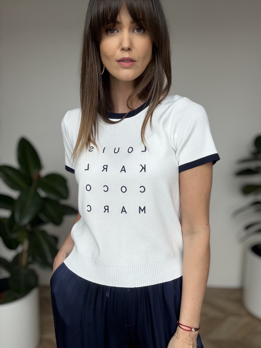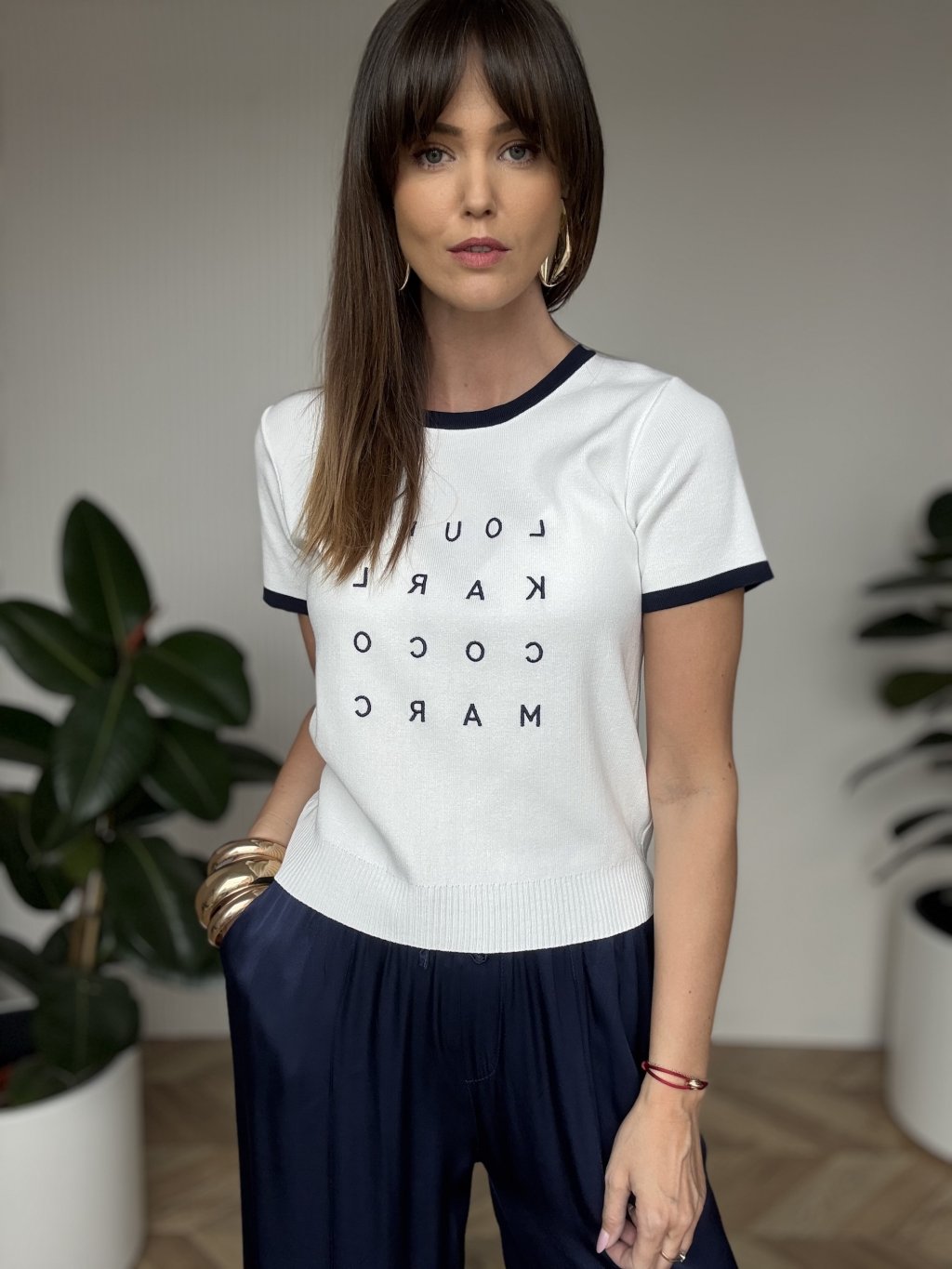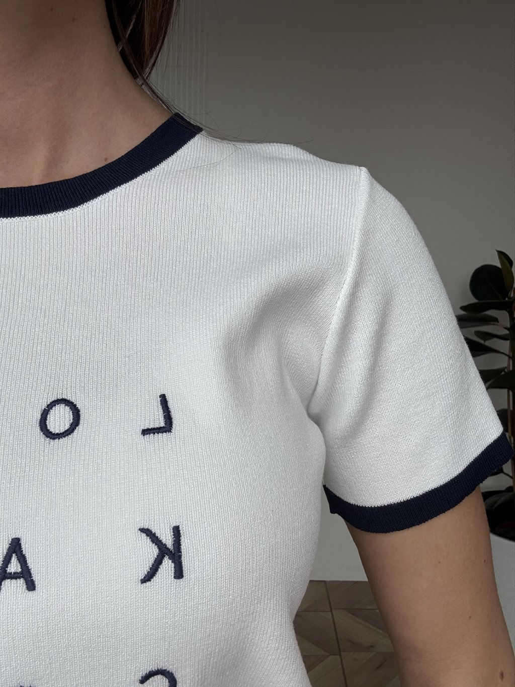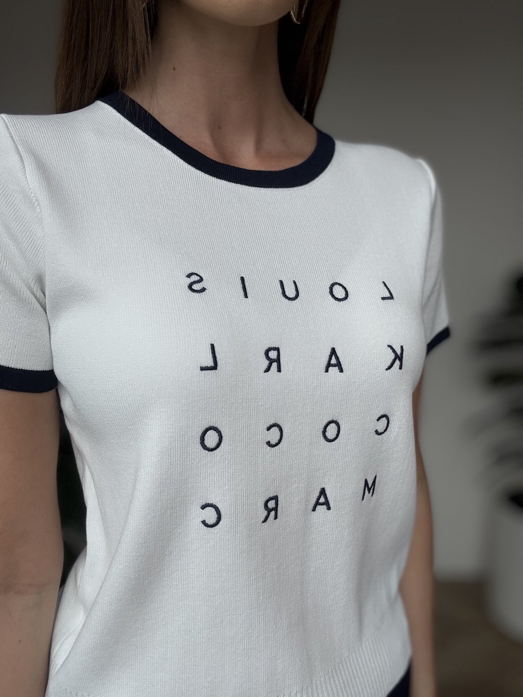 An elegant knitted top with short sleeves and subtle ribbed trims at the neckline, sleeves, and hem. Decorated with unique embroidery inspired by the names of iconic fashion designers. The soft, stretchy fabric adapts to the body and ensures maximum comfort. Perfect for pairing with trousers or skirts, suitable for both everyday wear and stylish occasions.
