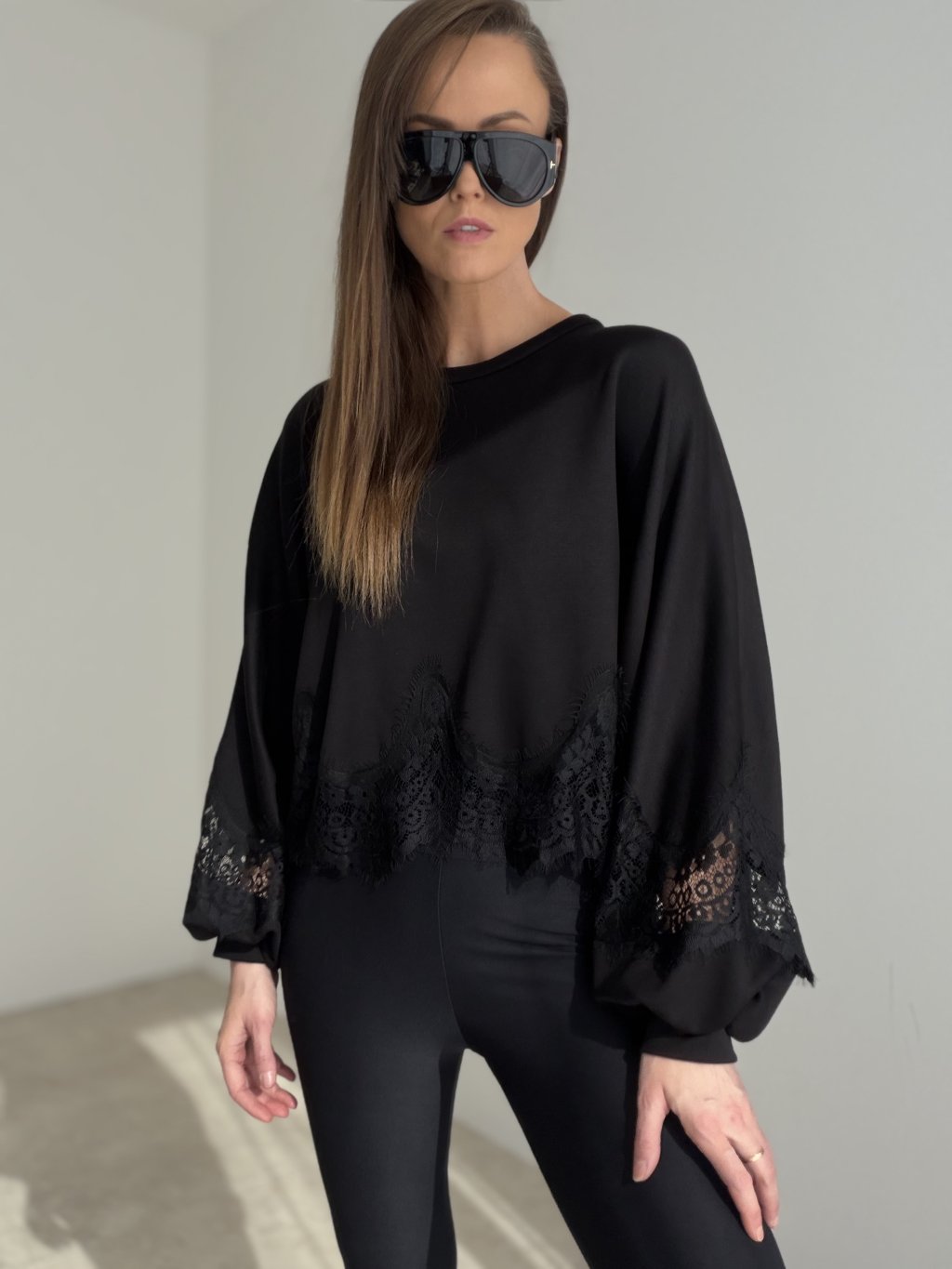 A striking and original piece that combines the comfort of a sweatshirt with the softness and elegance of lace detailing. The loose fit feels modern, airy, and beautifully feminine, making this design a standout part of any outfit. The wide sleeves and flowing silhouette create an eye-catching fashion effect, while the lace trim adds a delicate and sophisticated touch. This model pairs perfectly with fitted trousers, leggings, and more elegant pieces, making it easy to create a stylish and distinctive look. The fabric is comfortable to wear and ideal for women who want to combine comfort with a refined feminine detail.
