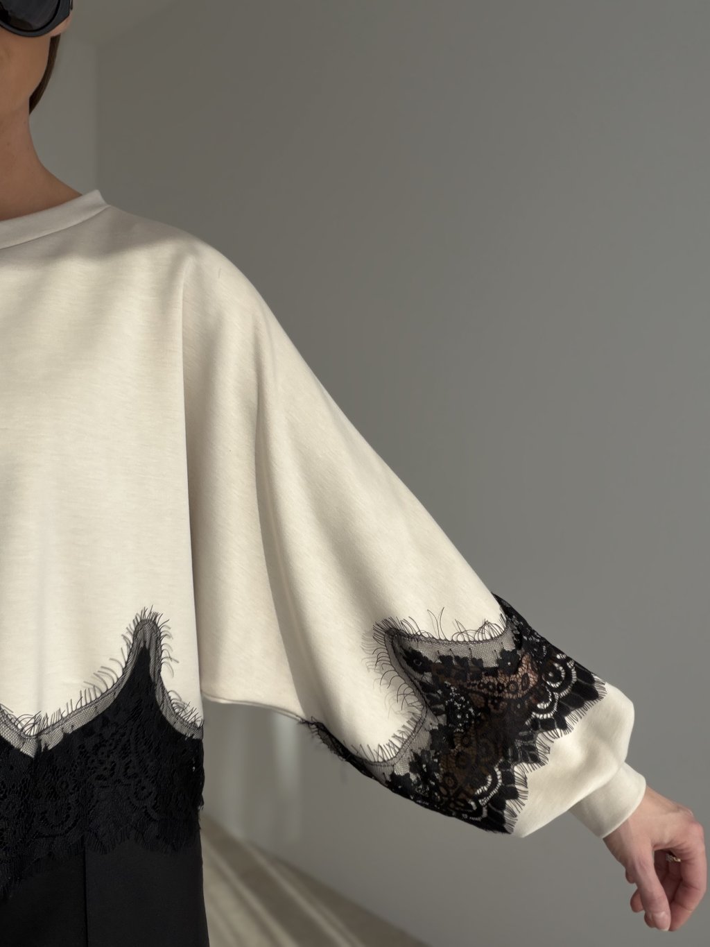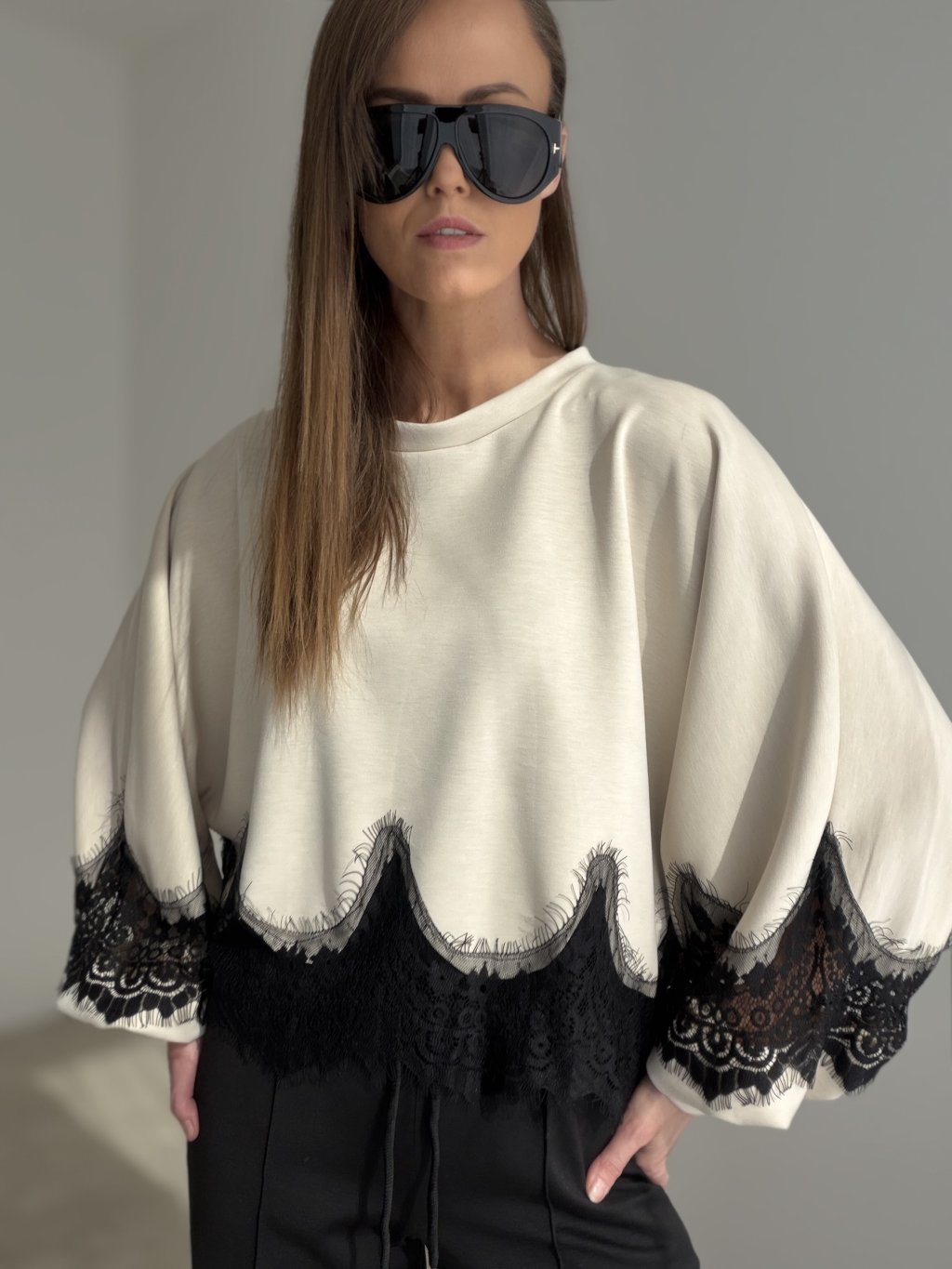 A striking and original piece that combines the comfort of a sweatshirt with the softness and elegance of lace detailing. The loose fit feels modern, airy, and beautifully feminine, making this design a standout part of any outfit. The wide sleeves and flowing silhouette create an eye-catching fashion effect, while the lace trim adds a delicate and sophisticated touch. This model pairs perfectly with fitted trousers, leggings, and more elegant pieces, making it easy to create a stylish and distinctive look. The fabric is comfortable to wear and ideal for women who want to combine comfort with a refined feminine detail.