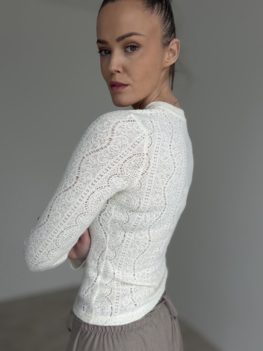 A delicate lace long-sleeve top that feels feminine, elegant and modern at the same time. The fitted silhouette follows the body nicely, giving a polished look even with simple styling. The lace texture adds a refined statement, making it perfect for everyday outfits as well as evening plans. A classic round neckline keeps the design clean and easy to pair with blazers, coats and bold accessories. Style it with high-waisted trousers, a skirt, or layer it under dresses for a chic finishing touch.