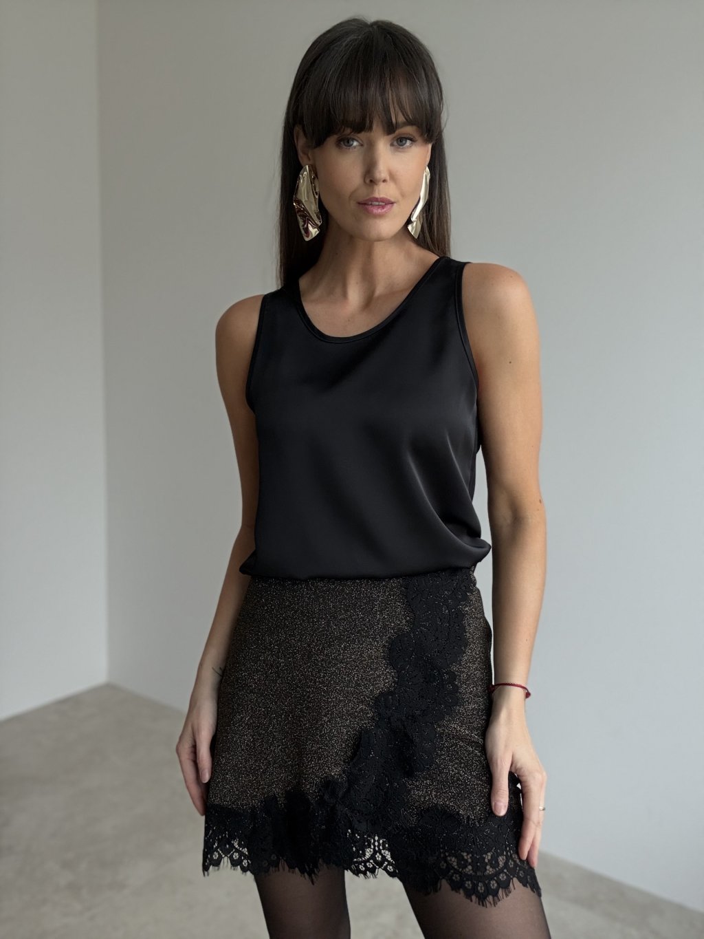 This elegant lurex mini skirt beautifully hugs the figure and creates a feminine silhouette, perfect for evening events, celebrations and special occasions. The shimmering fabric looks luxurious and gently reflects the light with every movement, making the outfit stand out effortlessly. The front is decorated with a delicate lace detail running in a slightly asymmetric line, visually slimming the figure and adding an interesting touch. The lace trim at the hem emphasizes the feminine character of the skirt and gives it a soft, romantic feel. The skirt features a comfortable waistband and a pleasant fabric, so you can feel confident and at ease all night long.