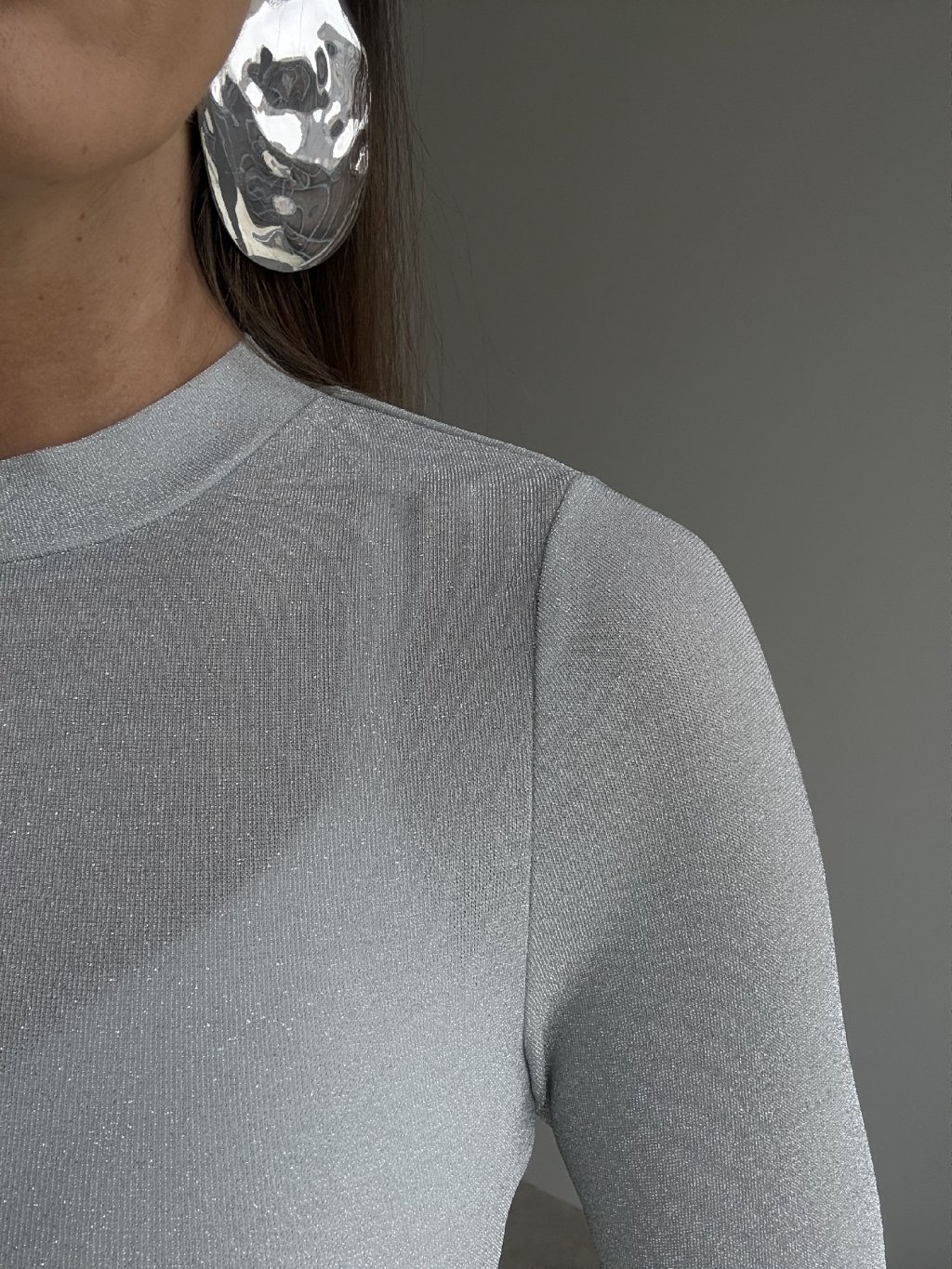 A subtle shimmering top made from a stretchy knit that flatters the silhouette and instantly elevates any outfit. Designed with a fitted shape, long sleeves, and a clean round neckline, it’s easy to style and always looks polished. The comfortable fabric adapts to the body and works perfectly both as a statement piece on its own or layered under a blazer.