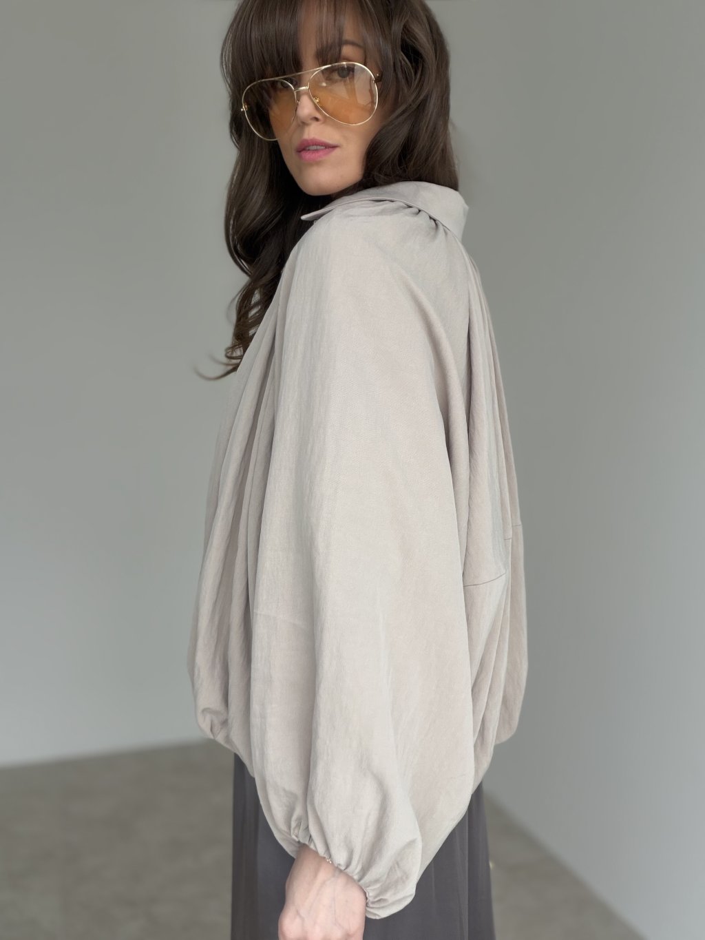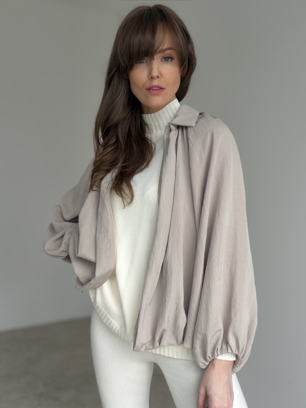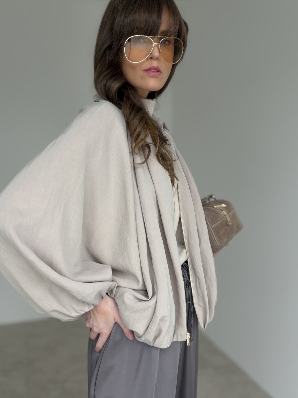 This lightweight lyocell jacket is a perfect layering piece for days when you want to look polished while staying comfortable. It features a relaxed, modern silhouette with statement sleeves that add soft volume without feeling heavy. The zip-front closure and collar keep the look clean and timeless, making it easy to wear for work, travel, or everyday city styling. Gentle elastic at the cuffs and hem helps the jacket keep its shape and sit nicely on the body, pairing effortlessly with high-waisted trousers, dresses, or skirts.