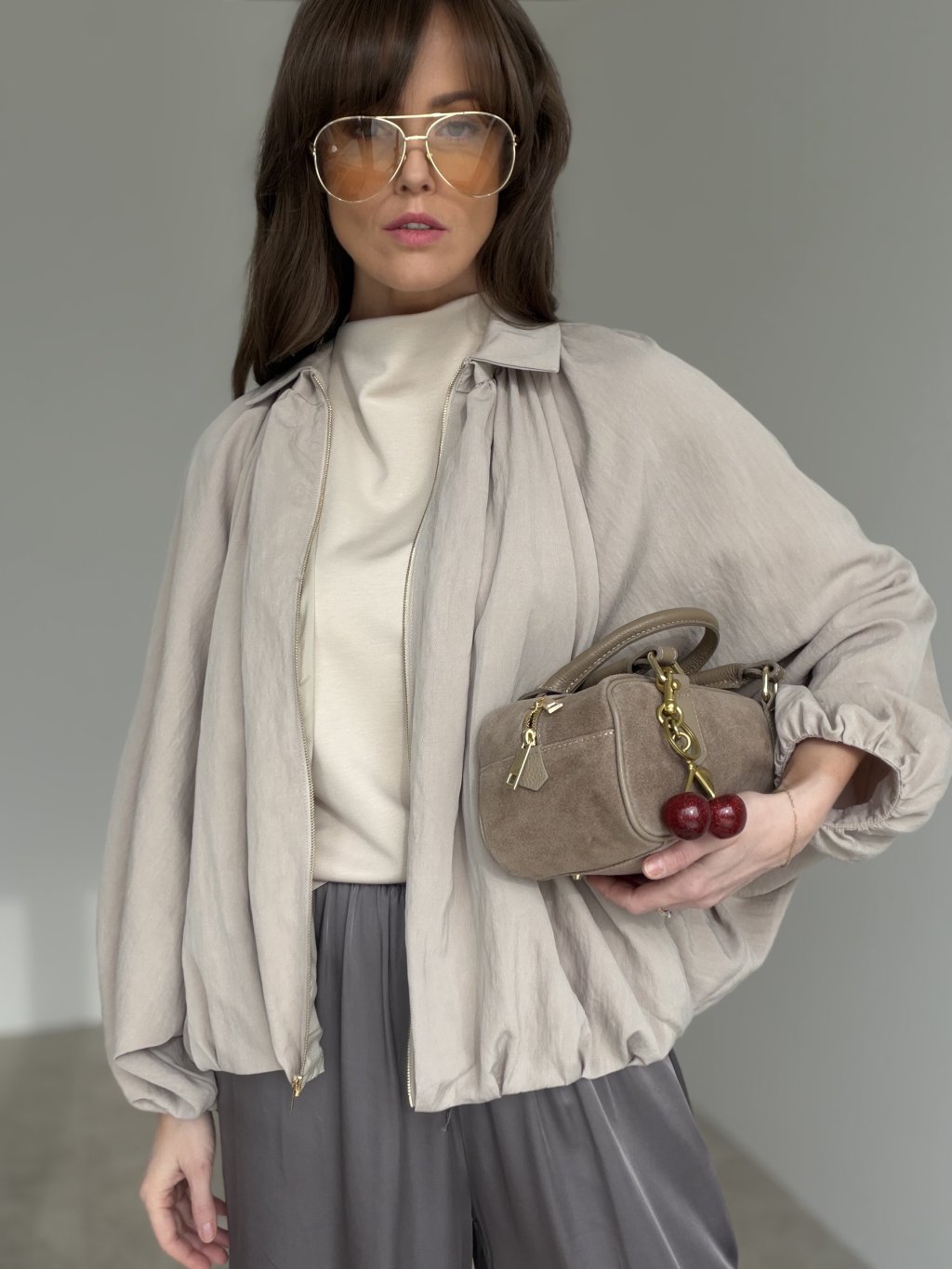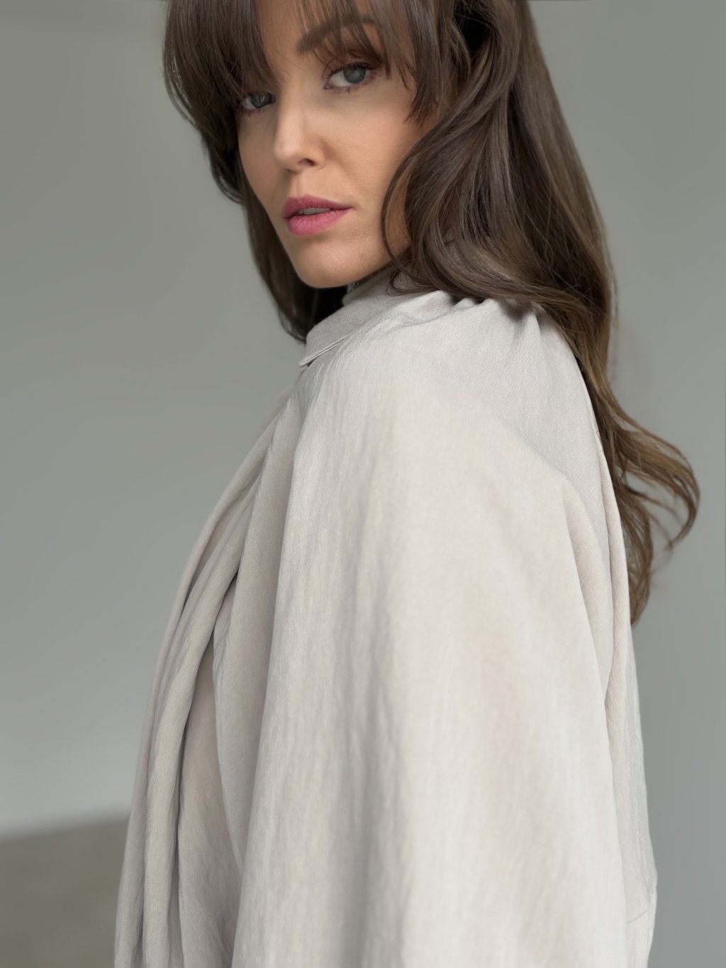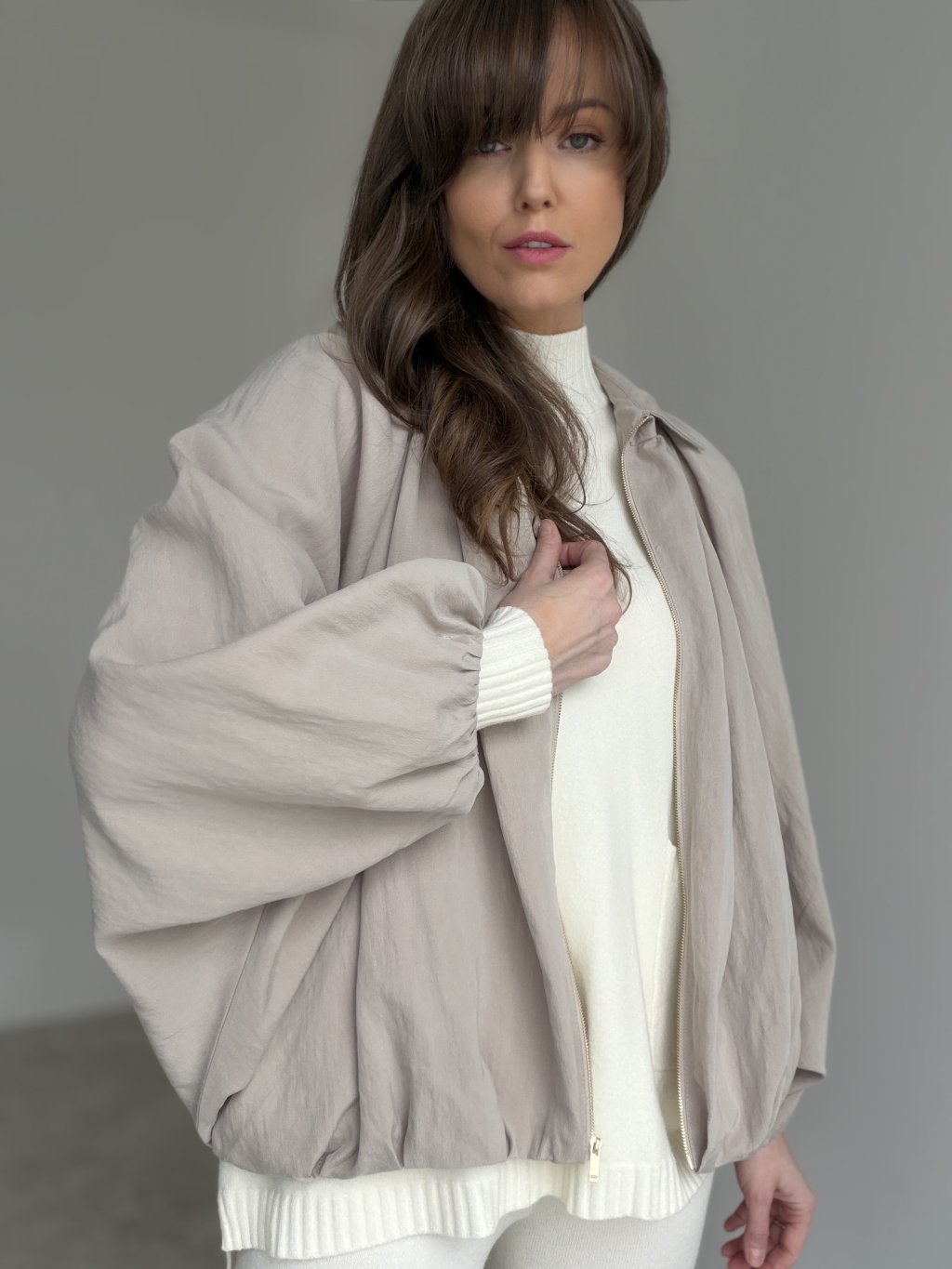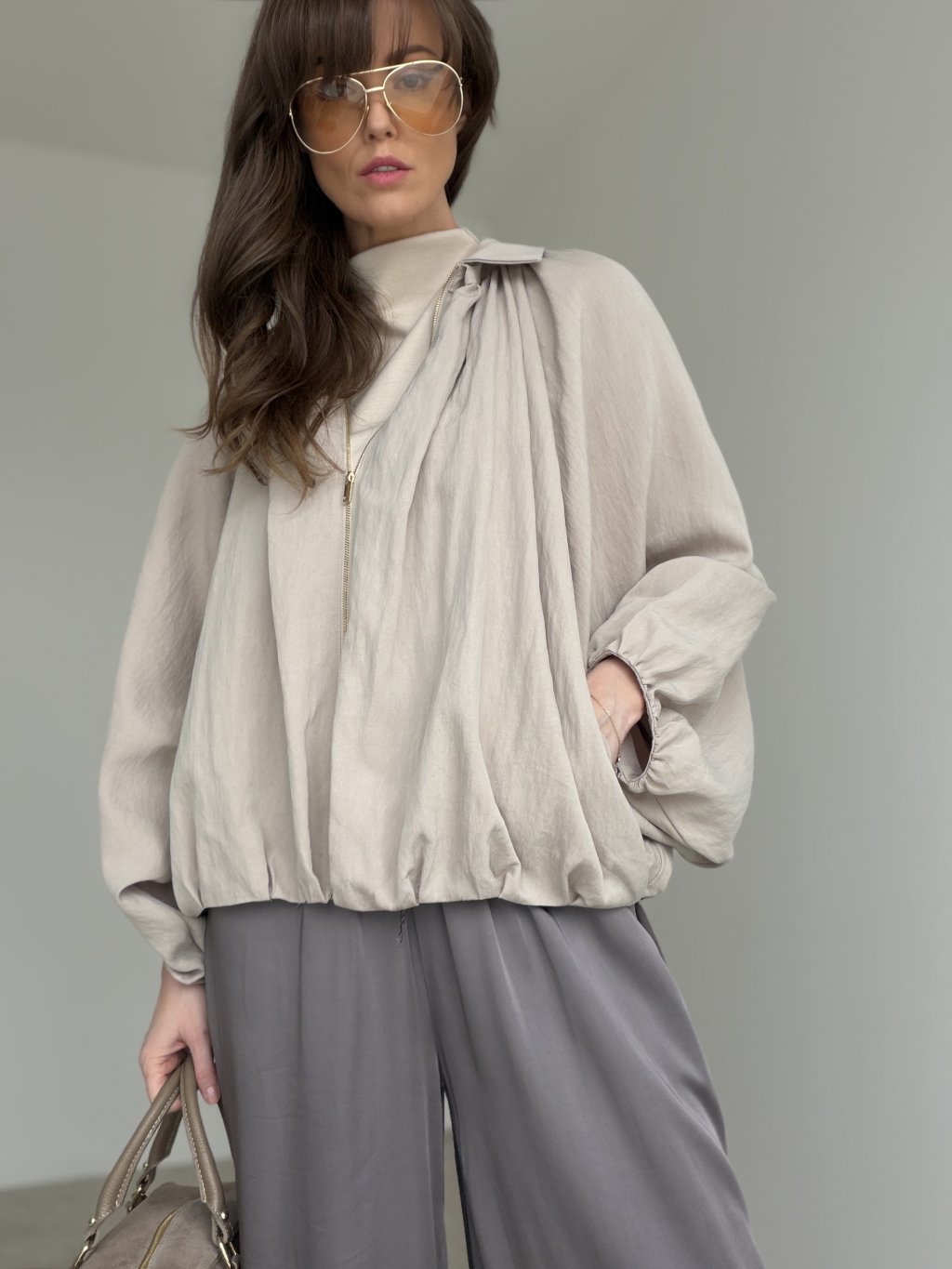 This lightweight lyocell jacket is a perfect layering piece for days when you want to look polished while staying comfortable. It features a relaxed, modern silhouette with statement sleeves that add soft volume without feeling heavy. The zip-front closure and collar keep the look clean and timeless, making it easy to wear for work, travel, or everyday city styling. Gentle elastic at the cuffs and hem helps the jacket keep its shape and sit nicely on the body, pairing effortlessly with high-waisted trousers, dresses, or skirts.