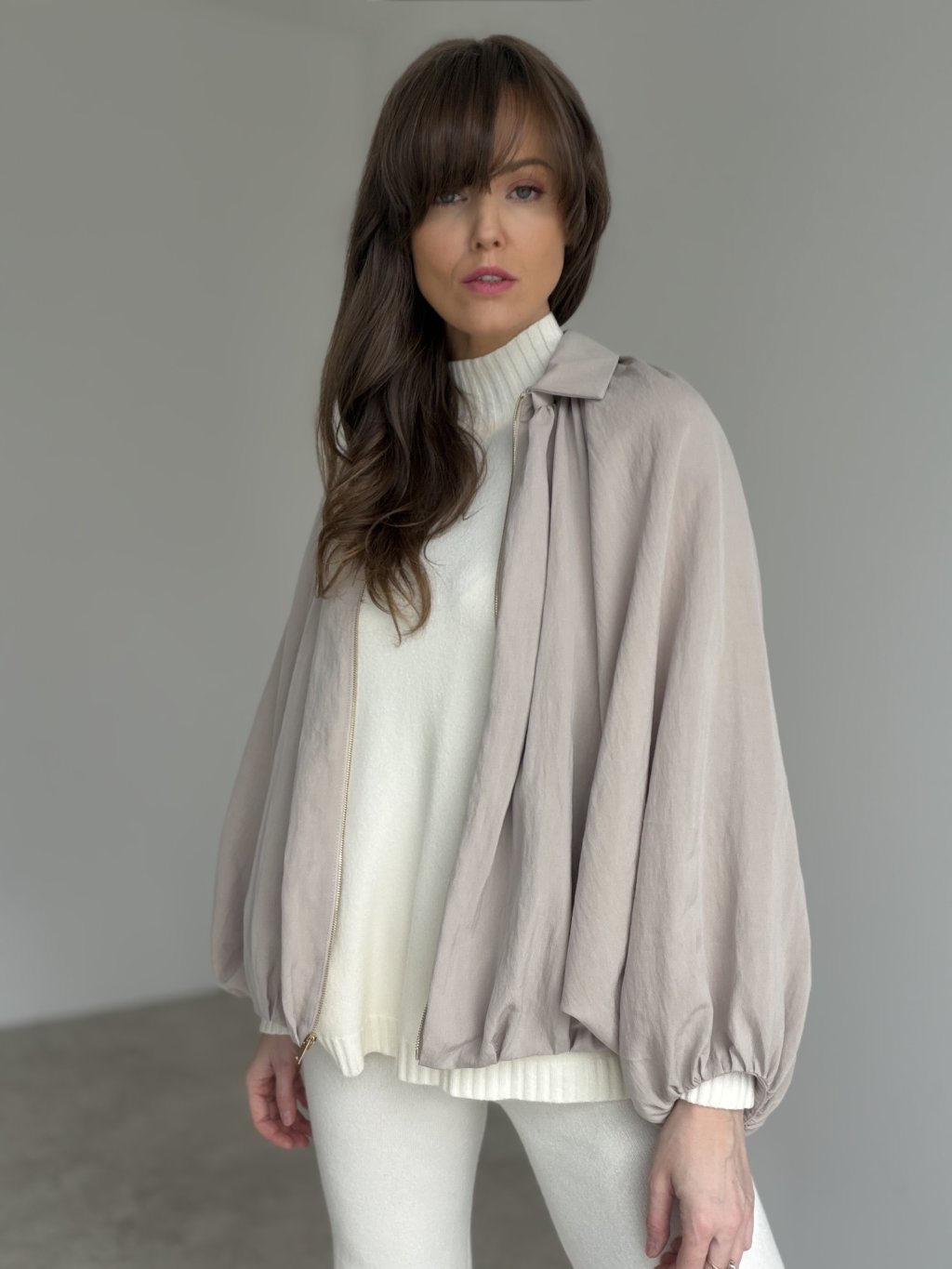 A lightweight lyocell jacket with a zip front and collar, featuring a relaxed fit and statement sleeves. It may arrive slightly wrinkled, so gentle steaming is recommended.