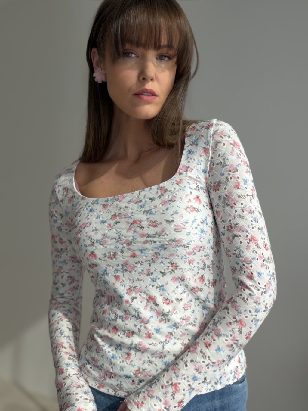 The cut highlights the silhouette while remaining comfortable to wear. Long sleeves enhance the romantic character of the piece, while the subtle broderie detailing on the sleeves adds an interesting and sophisticated touch. The neckline looks feminine and elegant, making this top perfect for everyday wear as well as more special occasions.