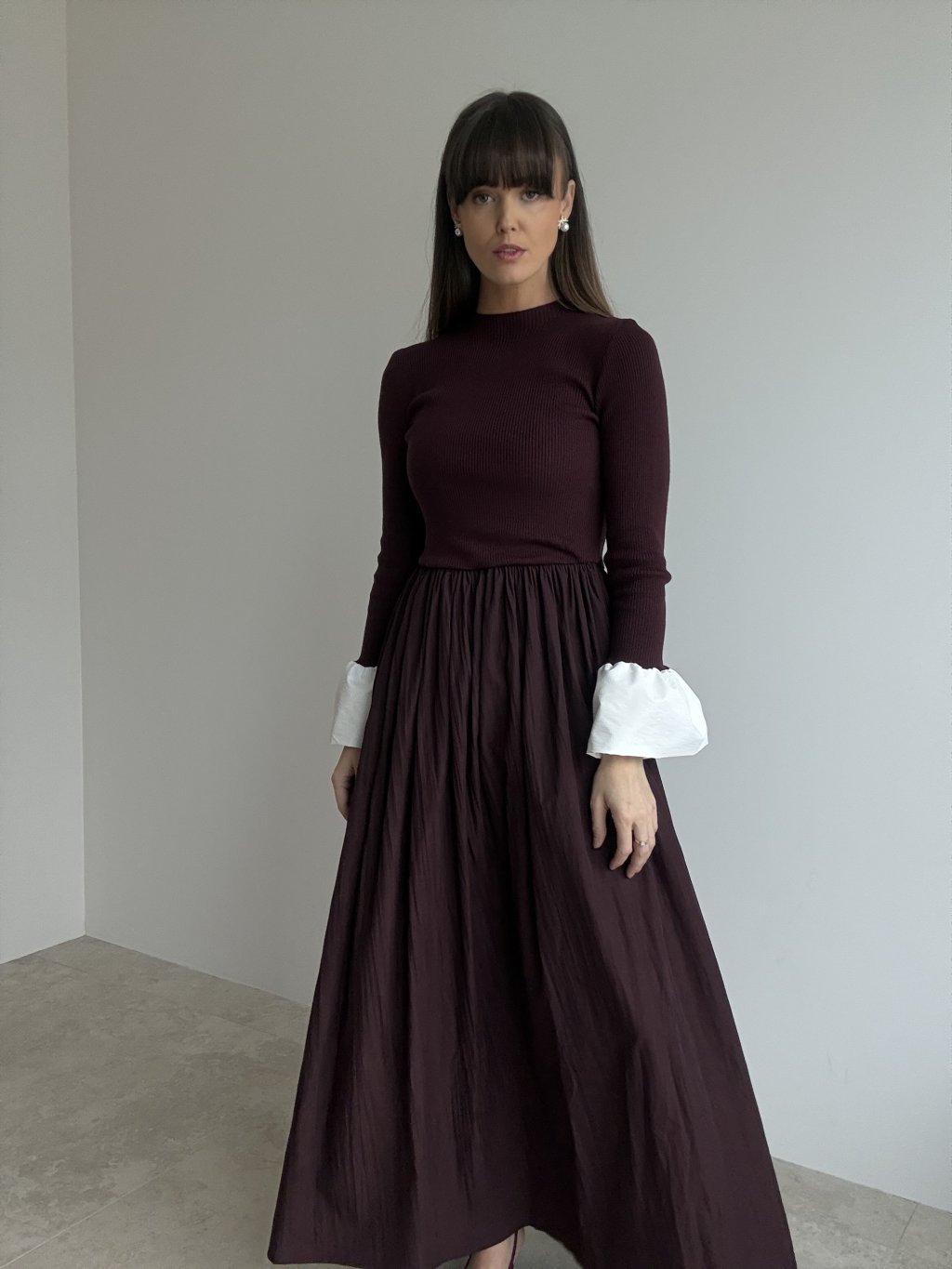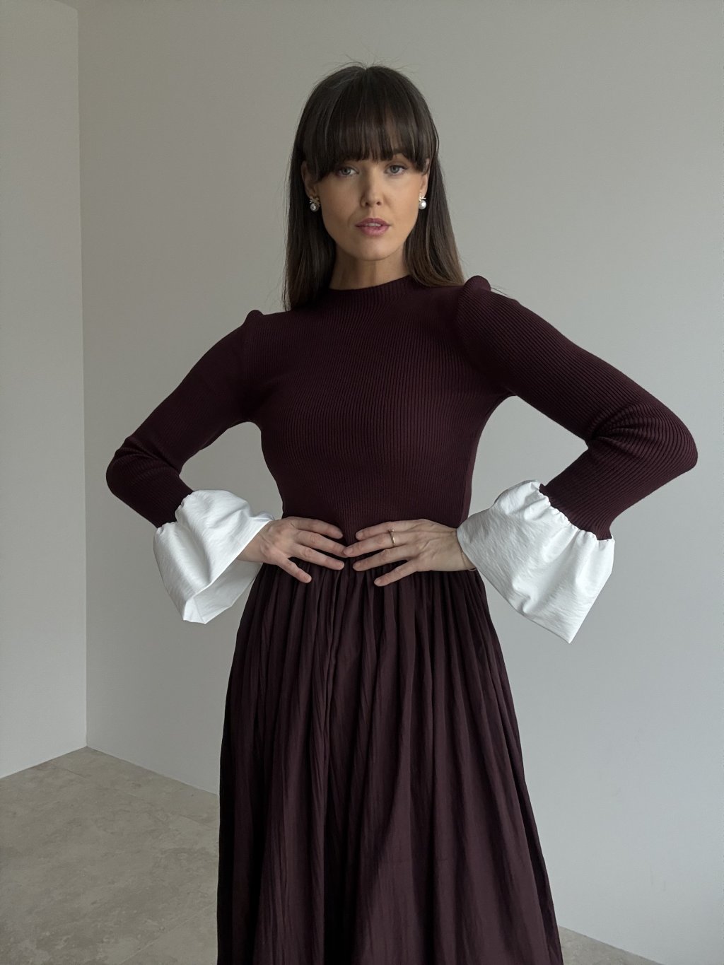 Elegant knitted maxi dress with a fitted top, gathered skirt and statement sleeve cuffs, perfect for occasions, work meetings and everyday elegance.