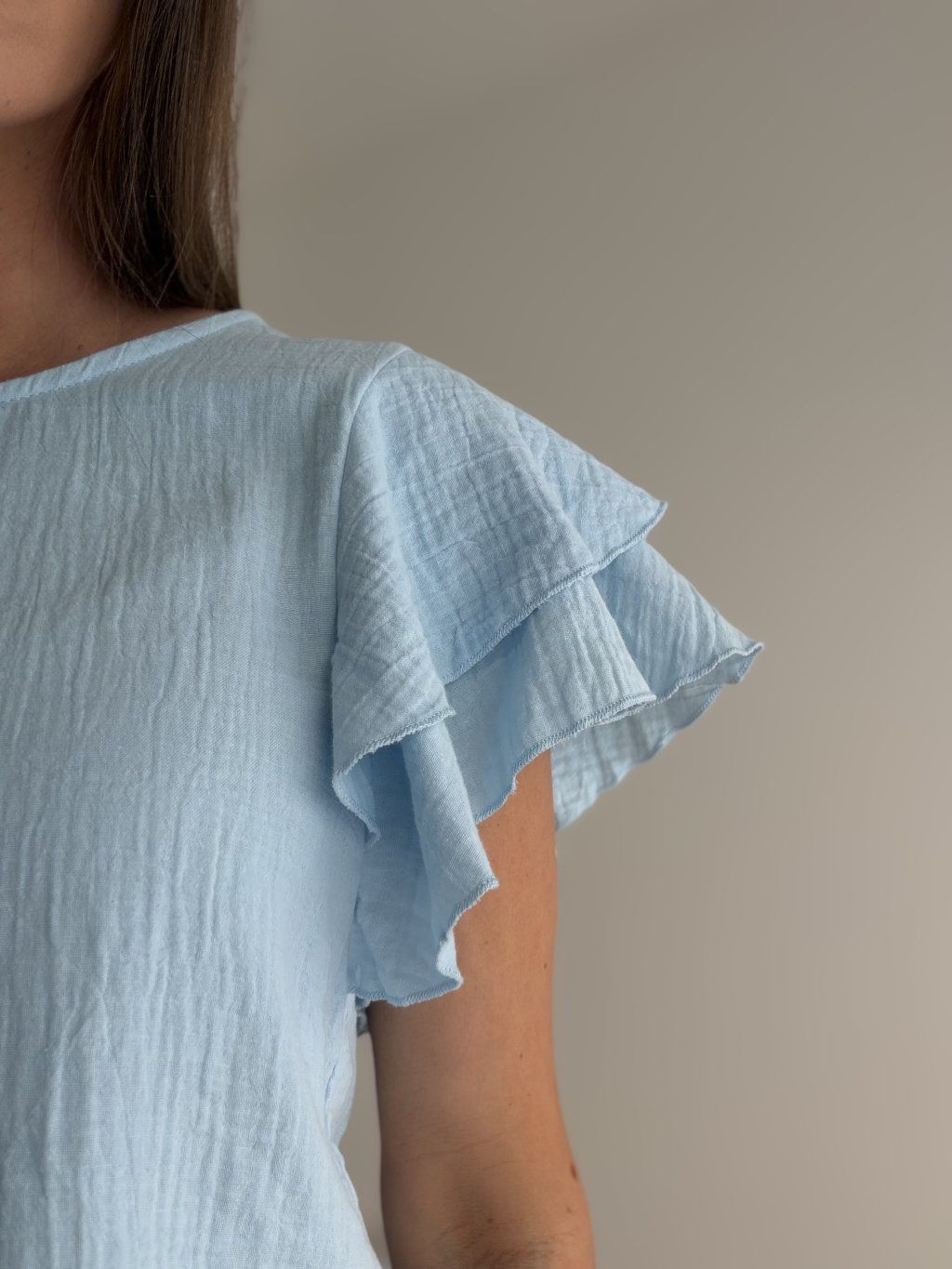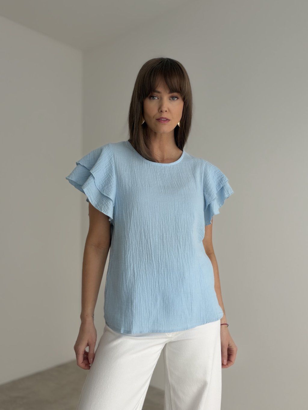 A muslin top with ruffled sleeves creates a light, feminine, and fresh look. It is comfortable, airy, and easy to style for everyday wear or more polished occasions.
