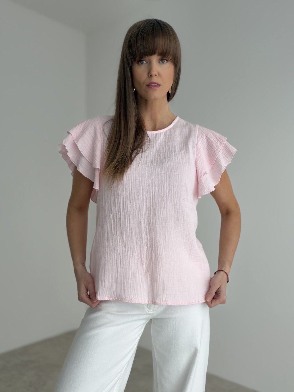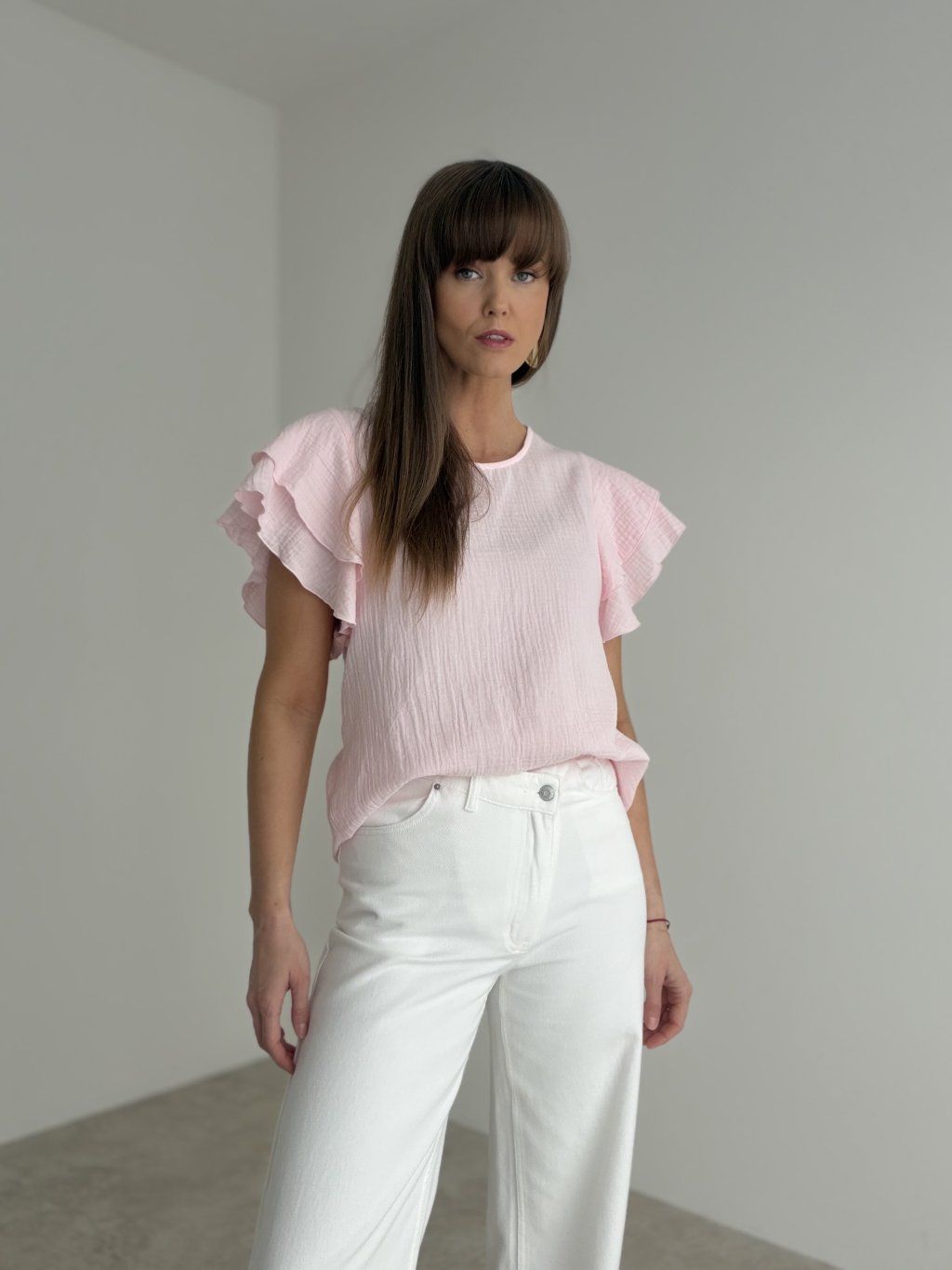 A muslin top with ruffled sleeves creates a light, feminine, and fresh look. It is comfortable, airy, and easy to style for everyday wear or more polished occasions.
