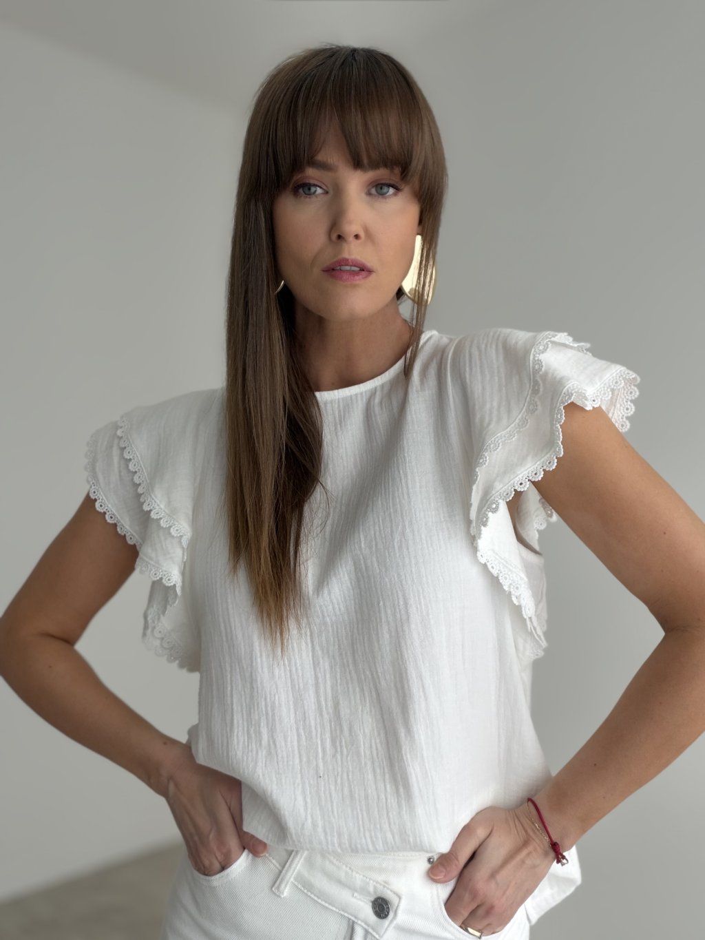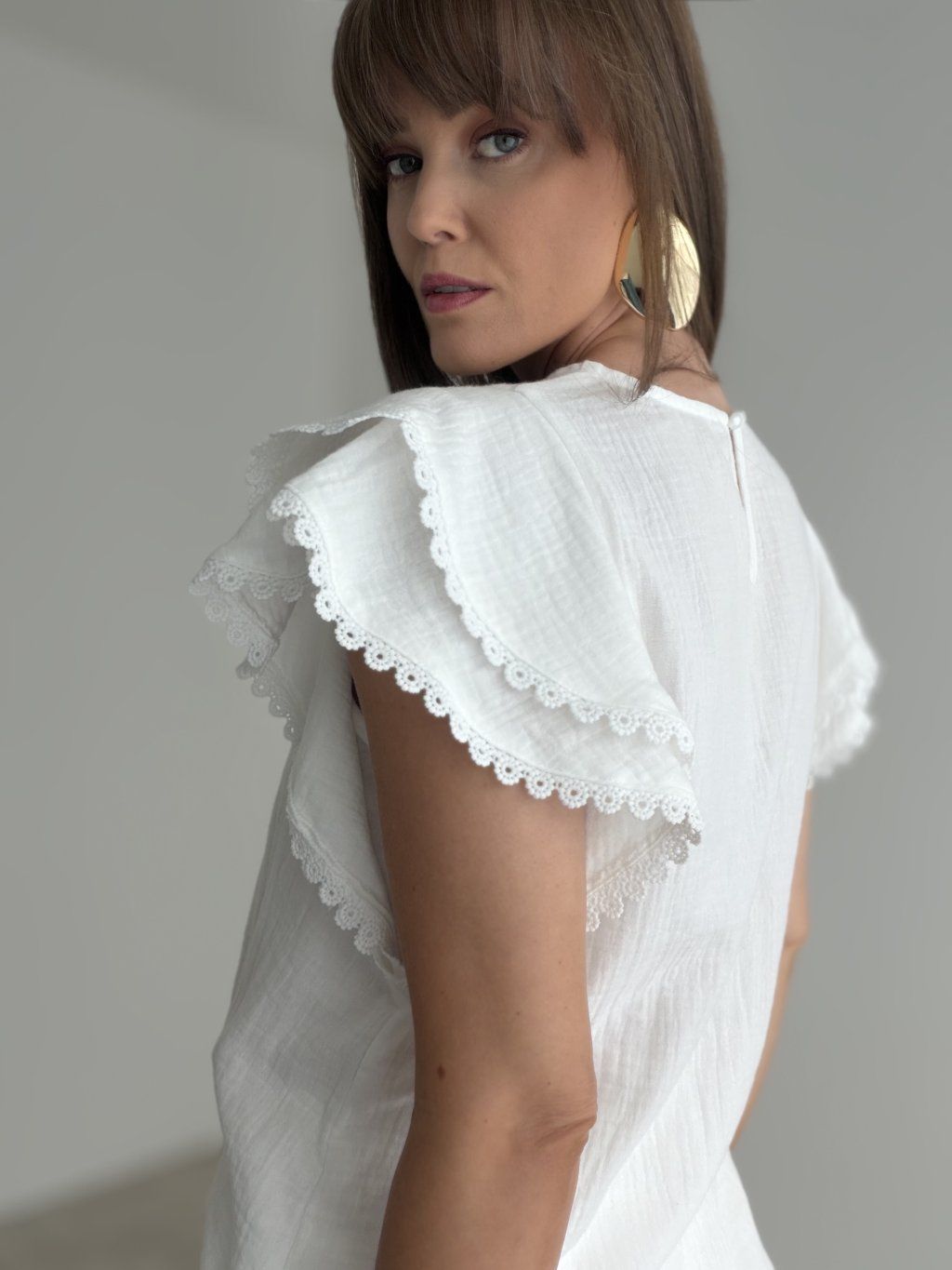 This muslin top is a soft and airy piece that feels feminine, light, and effortlessly elegant. It stands out with romantic sleeves finished with delicate decorative trim, giving the whole design a gentle and refined look. The pleasant fabric feels comfortable to wear, and thanks to its slightly relaxed fit, the top is perfect for everyday outfits as well as moments when you want to look stylish in an easy, natural way. It pairs beautifully with jeans, trousers, or a skirt, creating a fresh and tasteful outfit.